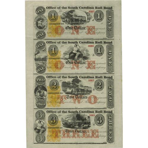 <B>Charleston, SC- Office of the South Carolina Rail Road</B></I> $1-$1-$2-$3 18__ Sheheen 663-662-666-669 Uncut Sheet<BR> This is a colorful uncut sheet with 5c revenue imprints and full selvage. There is a vertical center fold and folds between the notes. <B>Extremely Fine</B></I>.<BR><BR><b>Shipping:</b> Coins & Currency (<a target="_blank" href="http://www.heritageauctions.com/common/shipping.php">view shipping information</a>)