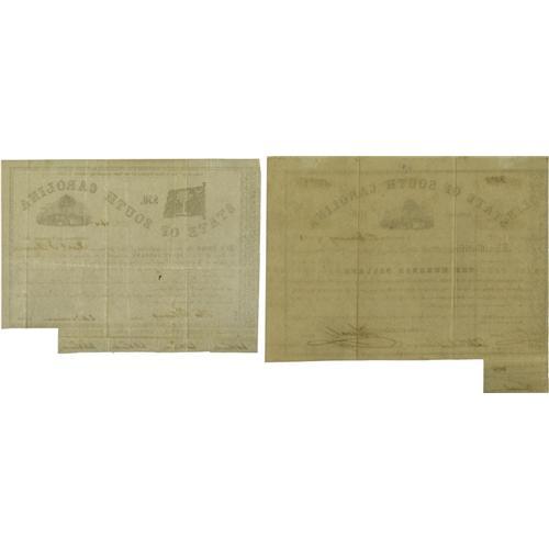 <B>Charleston, SC- State of South Carolina</B></I> $50; $100 Bonds 1861.<BR>The issued $50 bond grades a bright <B>Fine-VF,</B></I> with a couple of pinholes, while the $100 bond grades <B>XF</B></I> and it has toned. Both were once mounted with two stamp hinges.<BR><BR><BR><b>Shipping:</b> Coins & Currency (<a target="_blank" href="http://www.heritageauctions.com/common/shipping.php">view shipping information</a>)