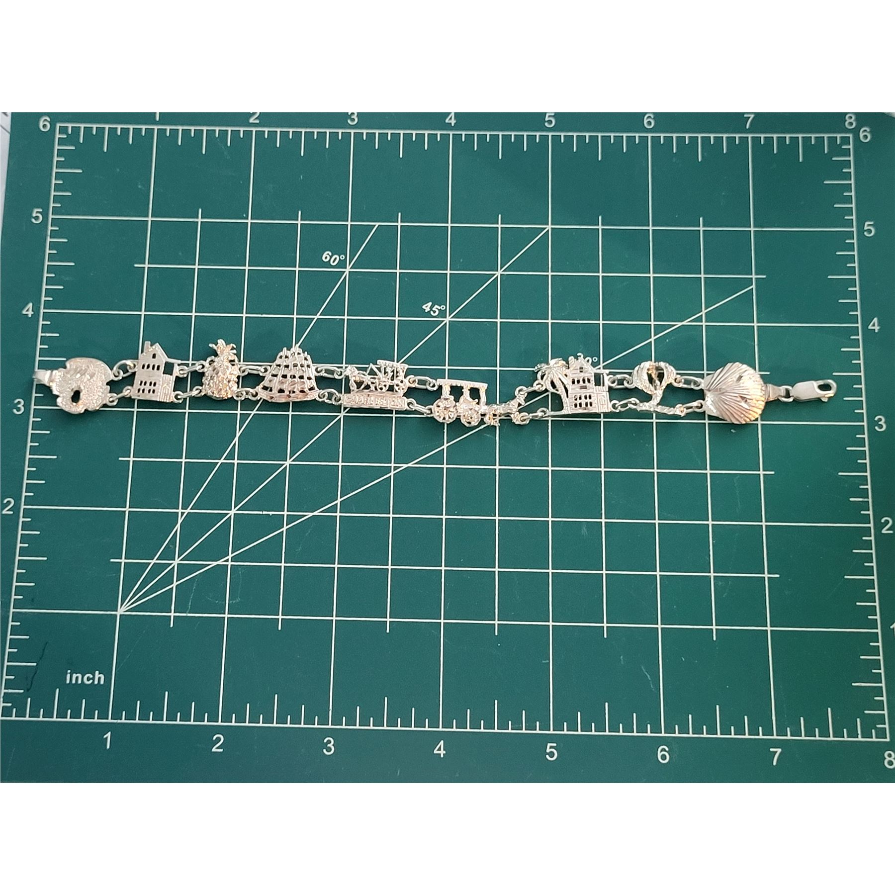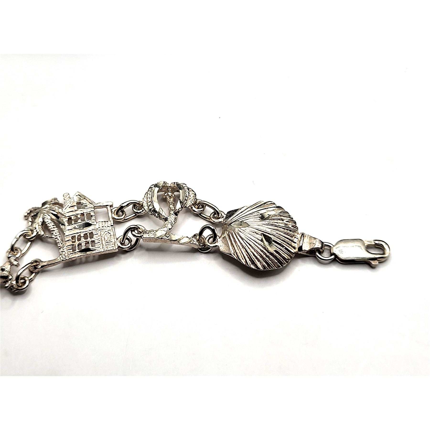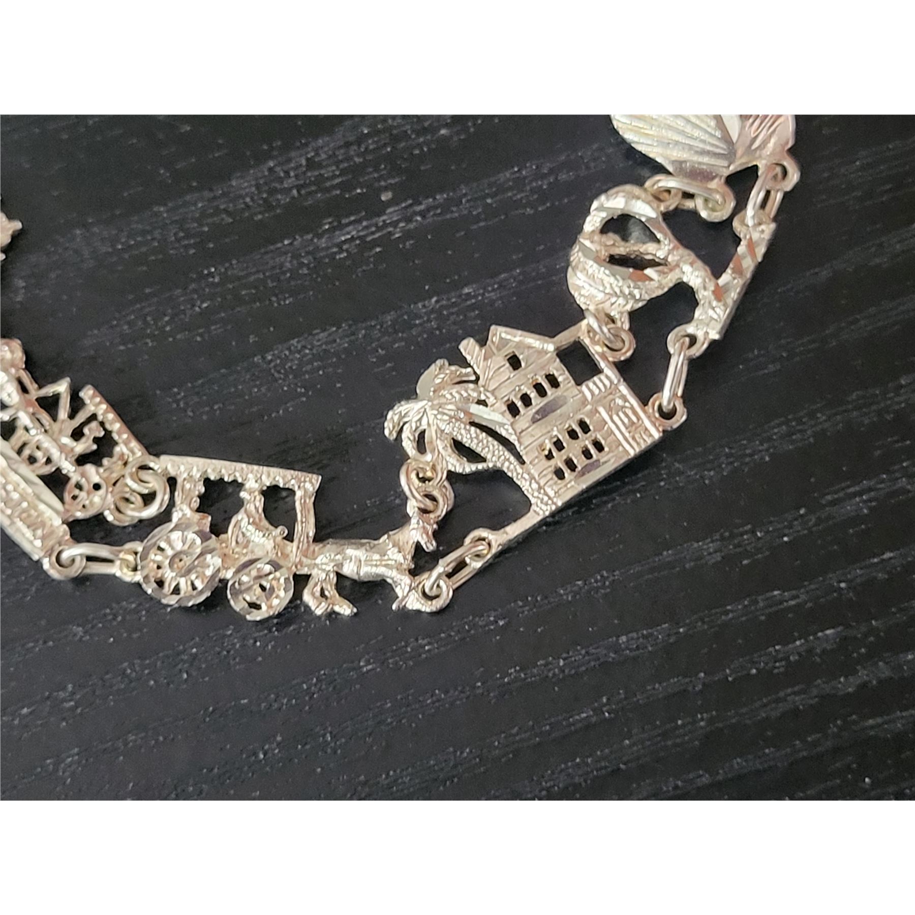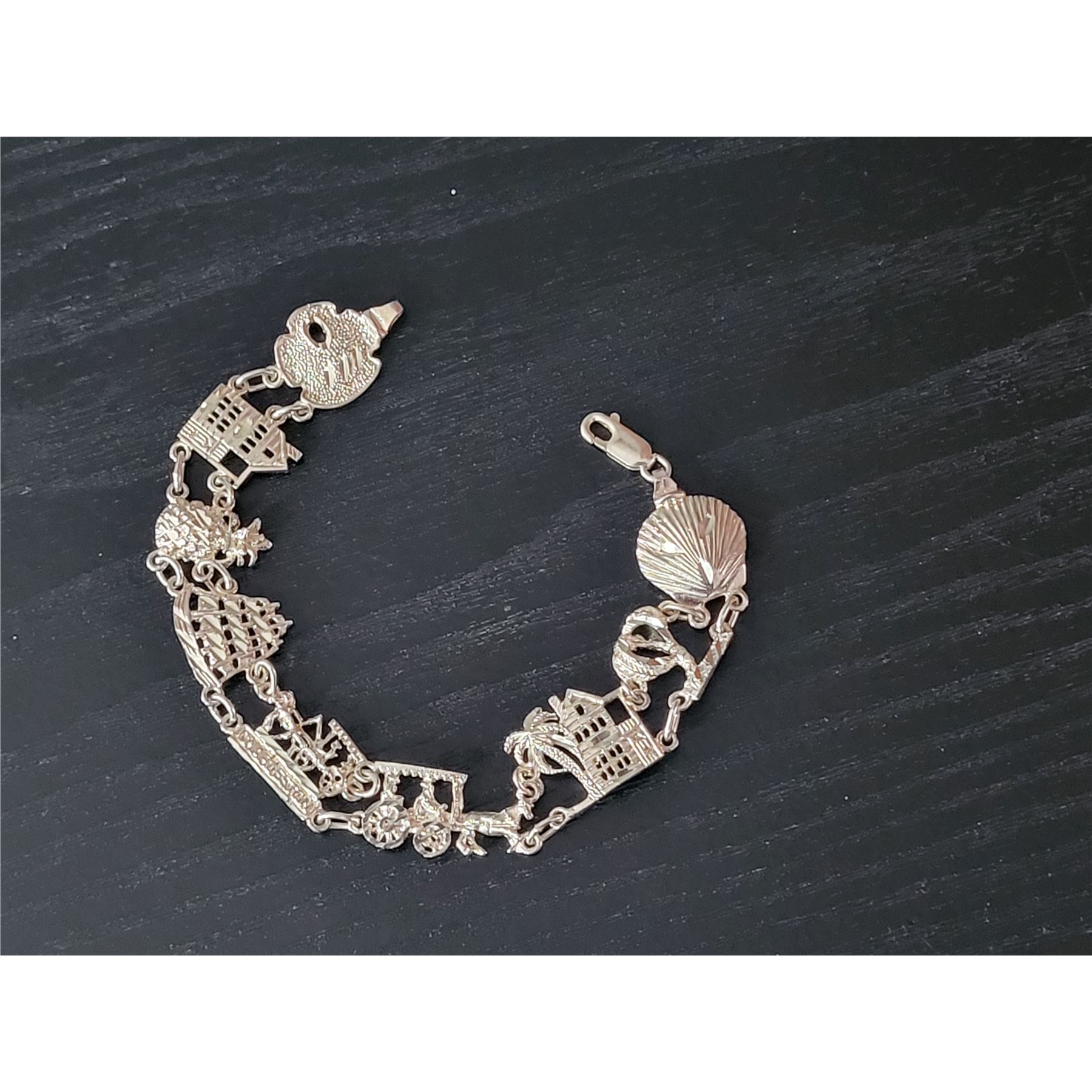 If you are from Charleston SC, or simply have wonderful memories of a visit to this historic southern city, this bracelet will be a fond reminder! Some of the things Charleston is best known for are represented on the individual links of this bracelet. It is 7" long with a lobster clasp. 15 grams. Admin: 33121/5-bg