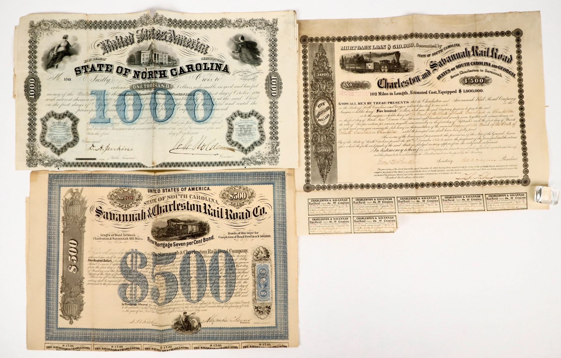 These bonds are for the Charleston and Savannah Rail Road Co. (1856)and the Savannah and Charleston Rail Road Co. (1869). Please see photo for details.