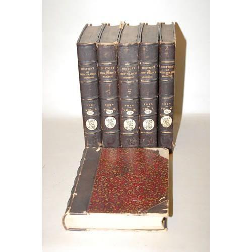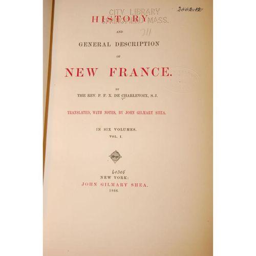 Charlevoix, Rev. P.F.X. De. History and General Description of New France - 6 Volumes. New York: John Gilmary, 4to - over 9¾" - 12" tall. Hard Cover. Ex-Library. Good Condition. 1866-1872. First Edition in English. Complete with 18 maps (of which 5 are folding), 15 plates and 4 facsimiles. Bound in 3/4 leather & marbled paper, raised bands on spines, marbled endpapers, binding & hinges tight. Covers have surface peeling.