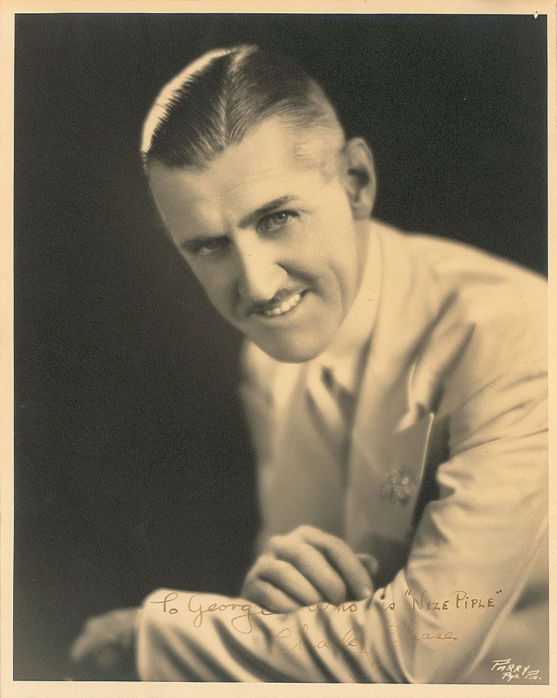 Vintage matte-finish 8 x 10 photo of a well-groomed Chase in a handsome suit, signed and inscribed to assistant director George Rhein in fountain pen “To George, Who is ‘Nize Piple,’ Charley Chase.” In fine condition, with portions of signature a bit light but fully legible, light rippling to top edge, tiny pinhole to upper right corner, and tape remnants from scrapbook removal on the reverse.