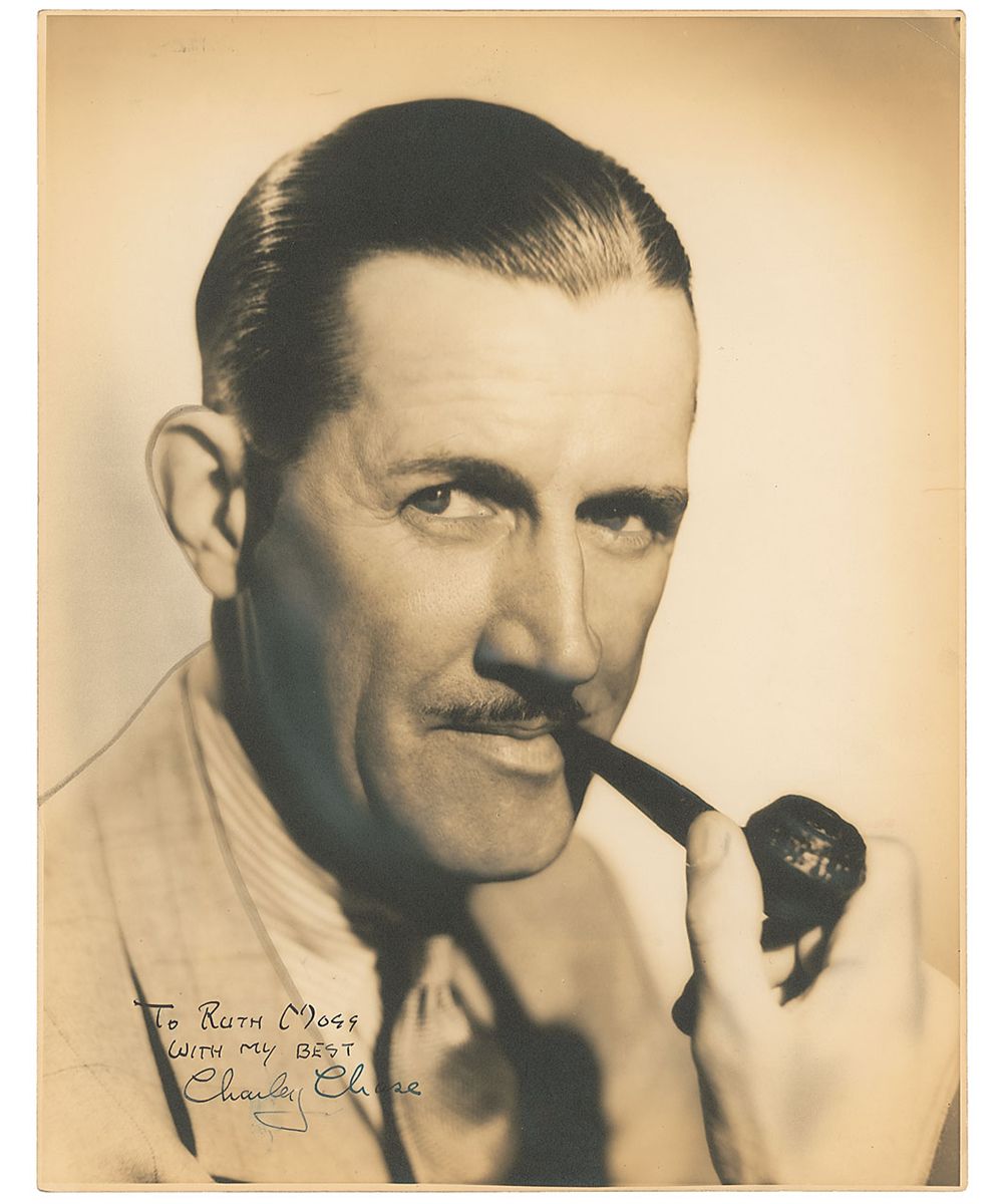 Actor, director, and screenwriter, most notably for his work in Hal Roach comedies. Chase started in silents but made a successful switch to sound until his drink-related death of a heart attack in 1940 at the age of 46. Matte-finish 10.5 x 13.5 Columbia Pictures publicity photo, inscribed in another hand in fountain pen, “To Ruth Moss, with my best,” and signed underneath “Charley Chase.” In fine condition, with some scattered light edge creases and a slight brush to signature.