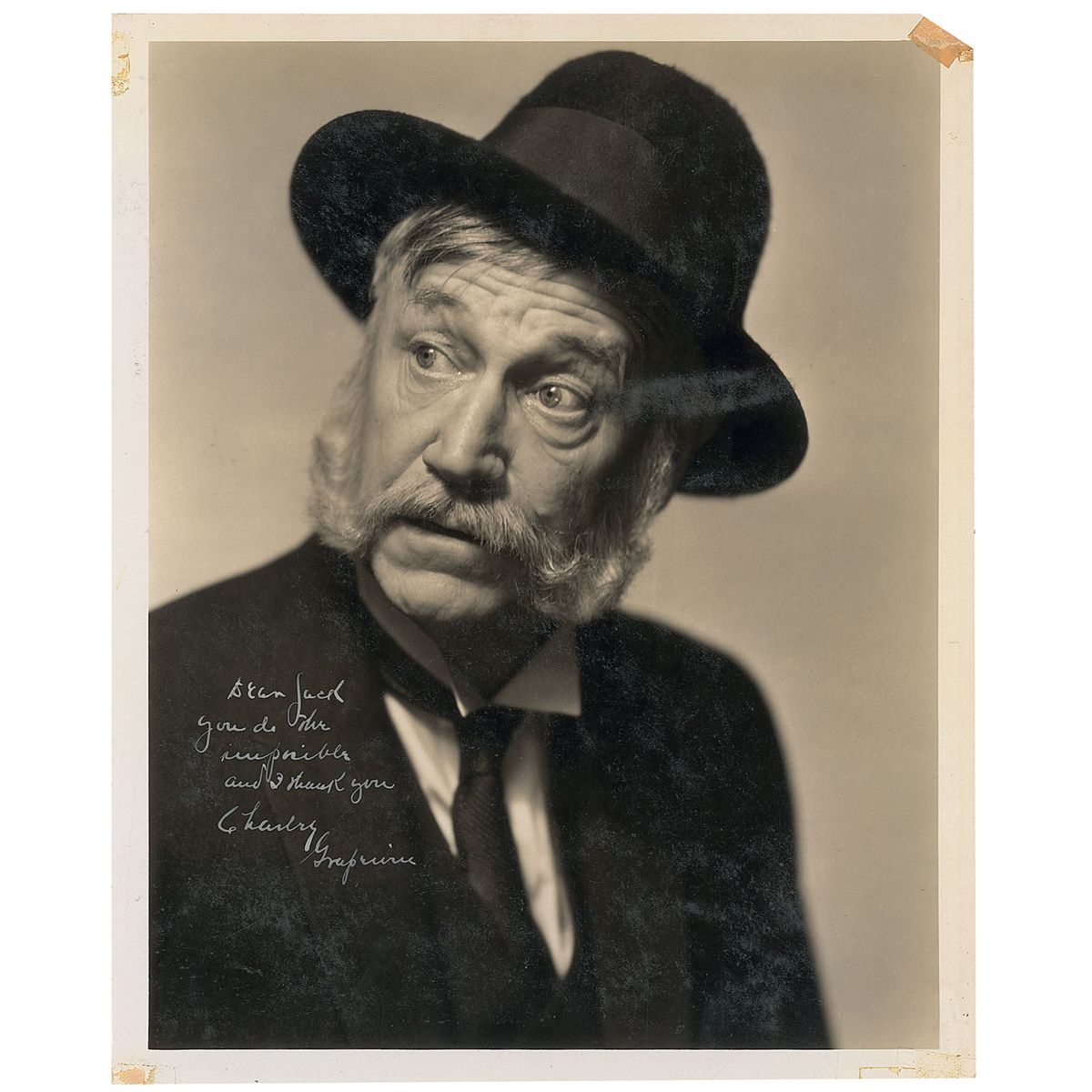 Character actor (1869–1956) best known for his role as Uncle Henry in The Wizard of Oz. Vintage glossy 8 x 10 double-weight Universal publicity photo of Grapewin as he appeared in Kiss Before the Mirror, signed and inscribed in white ink to legendary Universal make-up artist Jack Pierce, “Dear Jack, You do the impossible and I thank you. Charley Grapewin.” Mounting remnants to corners and scattered rubbing to finish, otherwise fine condition. Pierce did the make-up for the 1933 film and the photo comes directly from the Jack Pierce scrapbook.