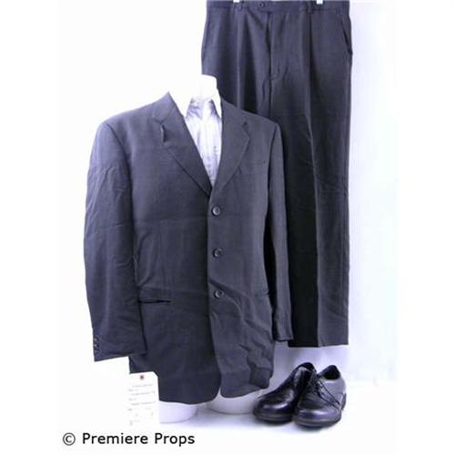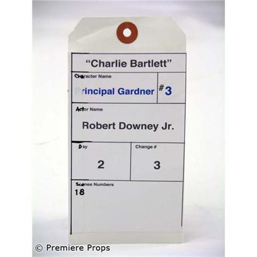 CHARLIE BARTLETT - Popularity is a state of mind. From the set of the coming of age film, this is Principal Gardner's (Robert Downey Jr.) screenworn hero costume. This costume features a black with two tone grey diagonal stitching "Armani" suit jacket, black with two tone grey diagonal stitching "Armani" suit pants, a white with multi stripes in sage burgundy and blue with velcro collared "Comme des Garcons" shirt and black leather lace up "Dressports by Rockport" dress shoes. Includes the original wardrobe tags! Don't miss this chance to own this key costume! Add it to your movie memorabilai collection today! (CHB1075)