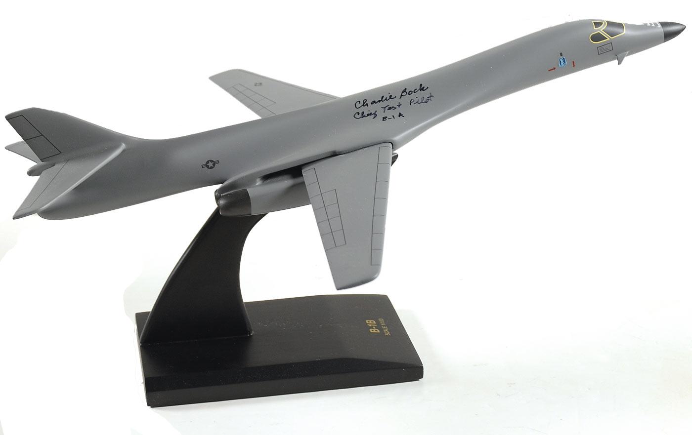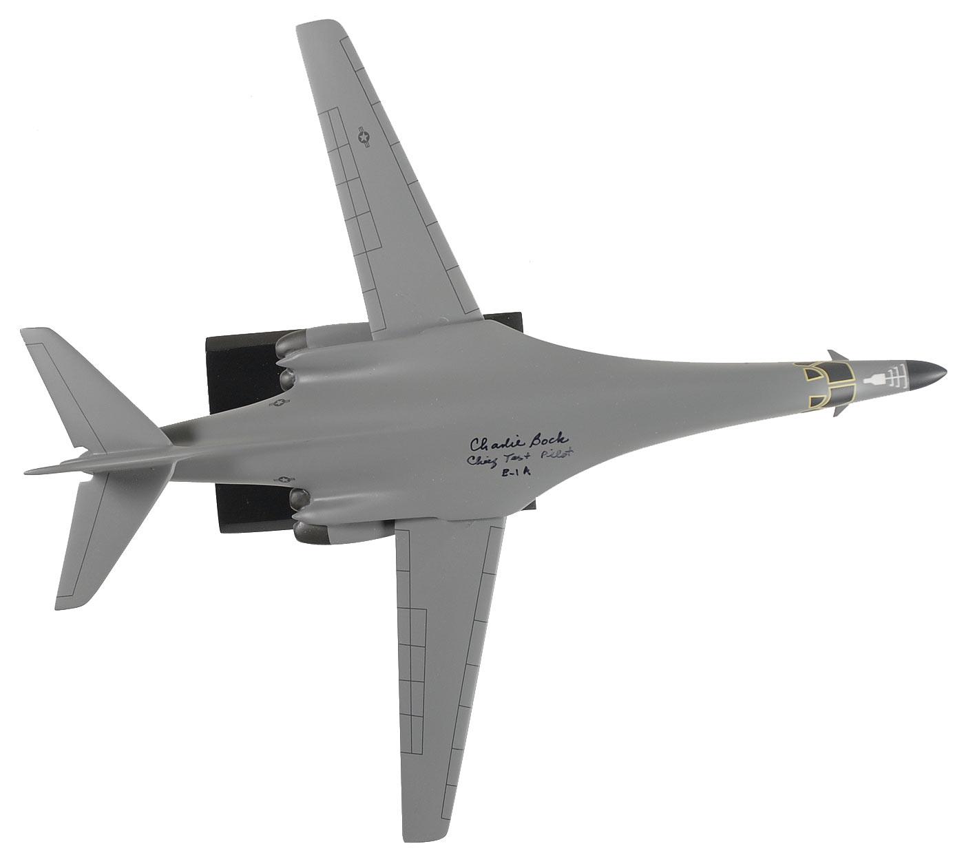 Test pilot. Scale model of a B-1-B signed in black felt tip, “Charlie Bock, Chief Test Pilot, B-1-B.” In fine condition with the slightly irregular ink adhesion to “Pilot.”