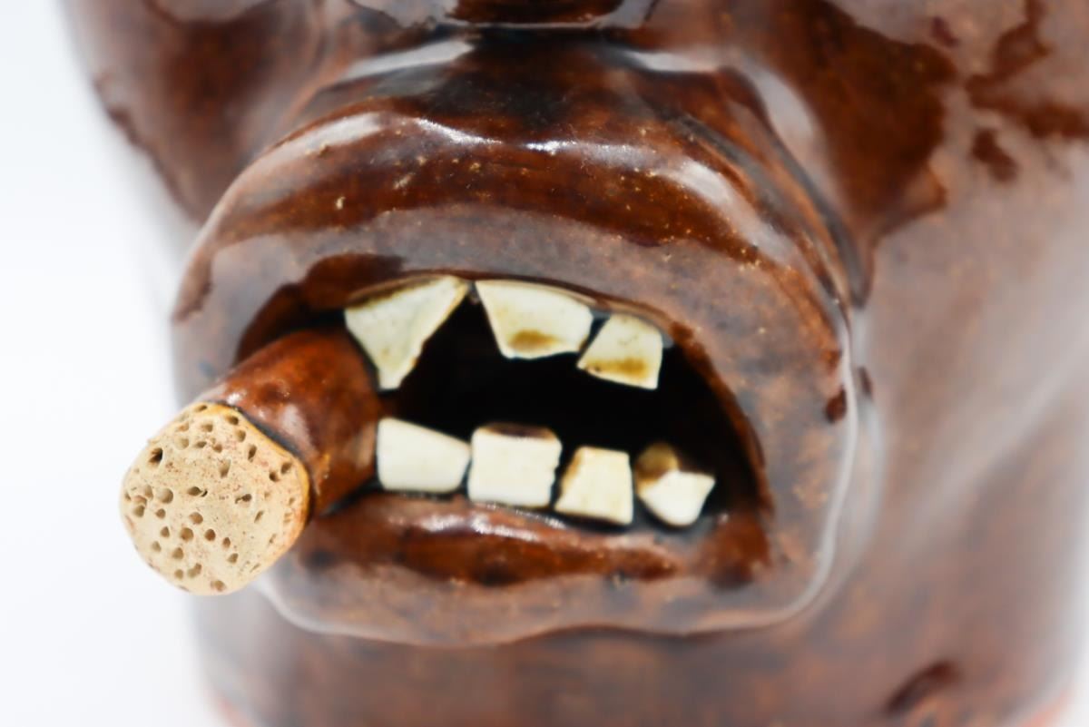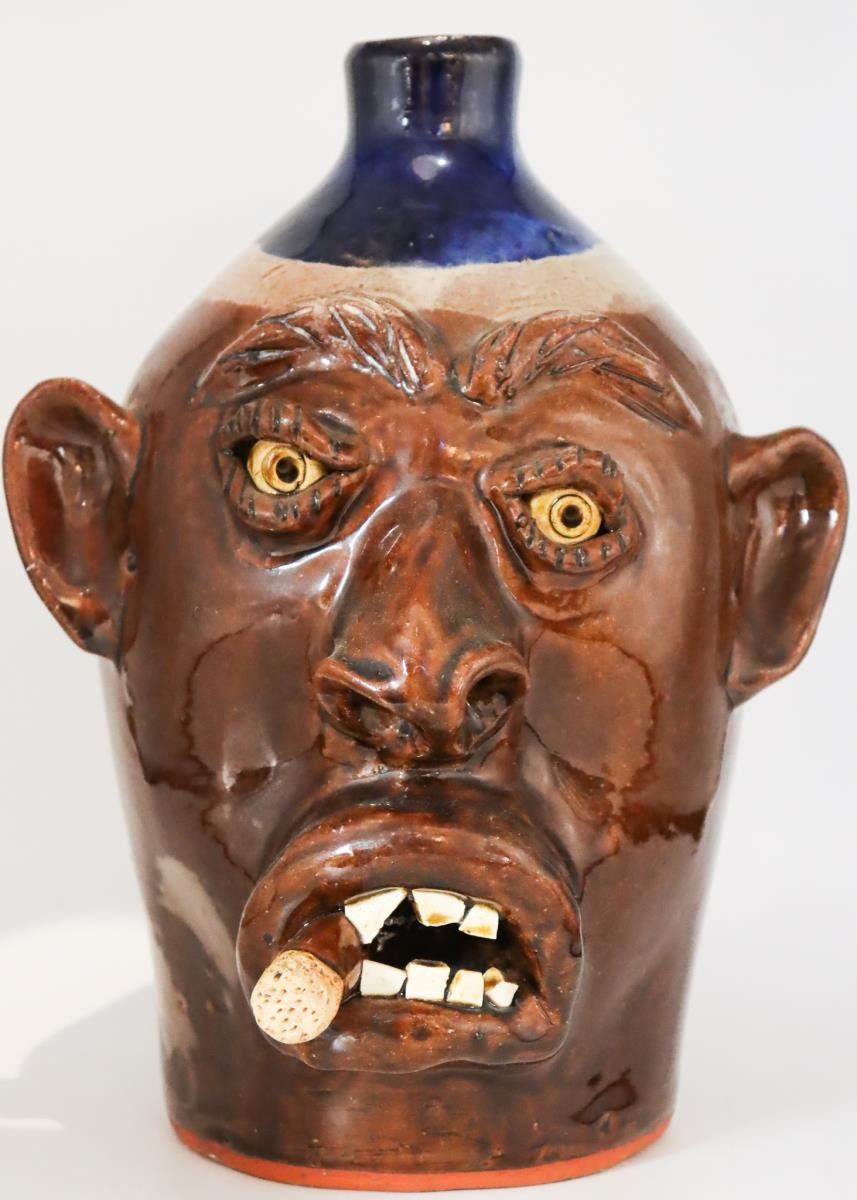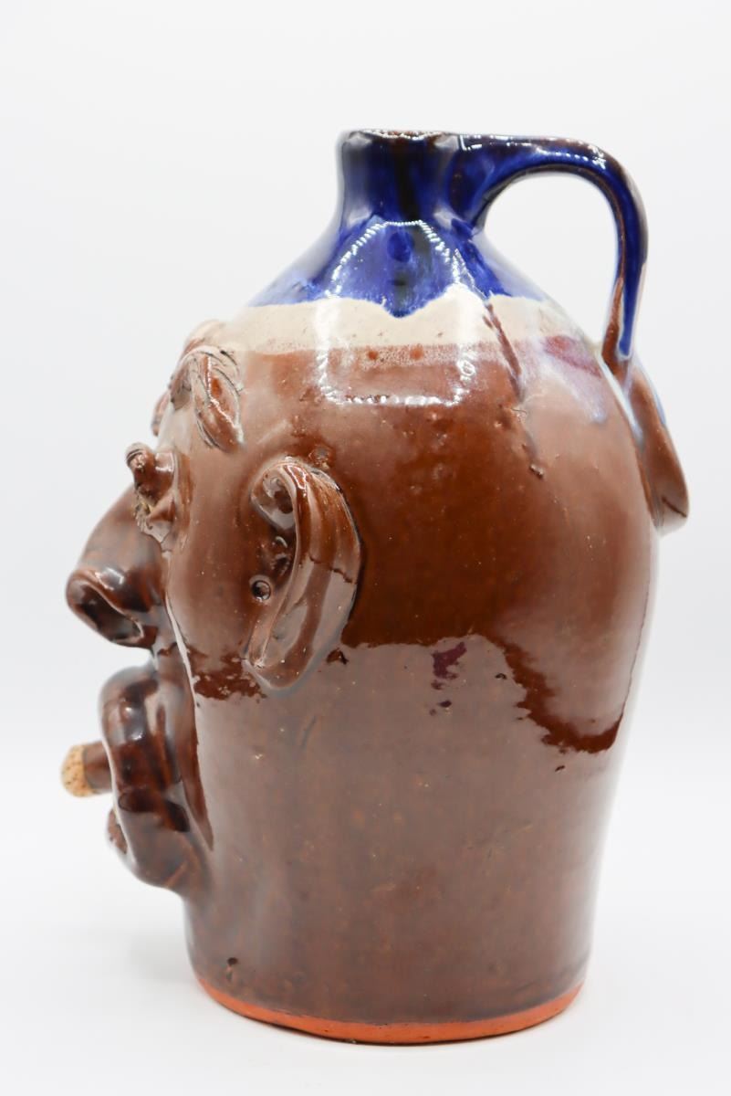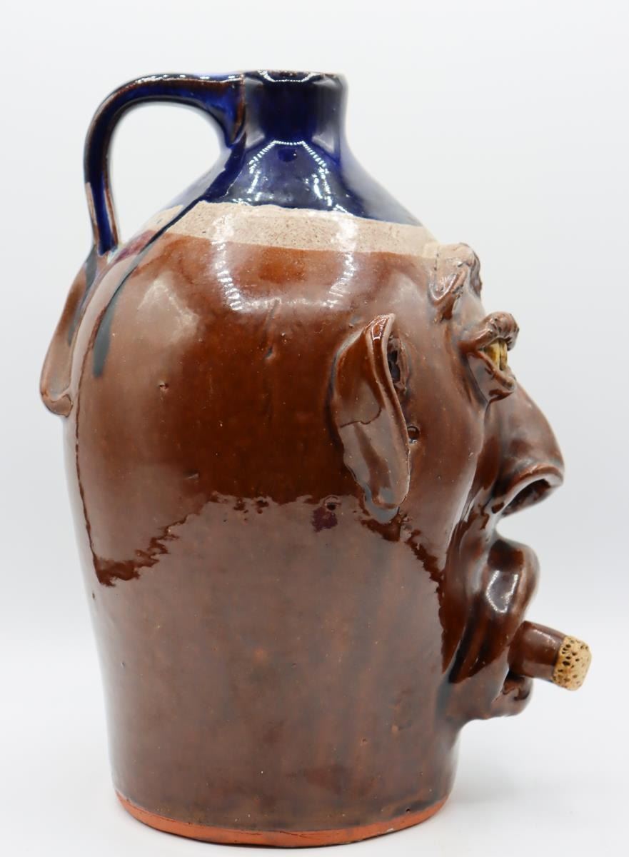 Three colors face jug with cigar (beautiful cobalt blue, white, and tobacco brown glaze. Awesome expression with cigar). Perfect condition.