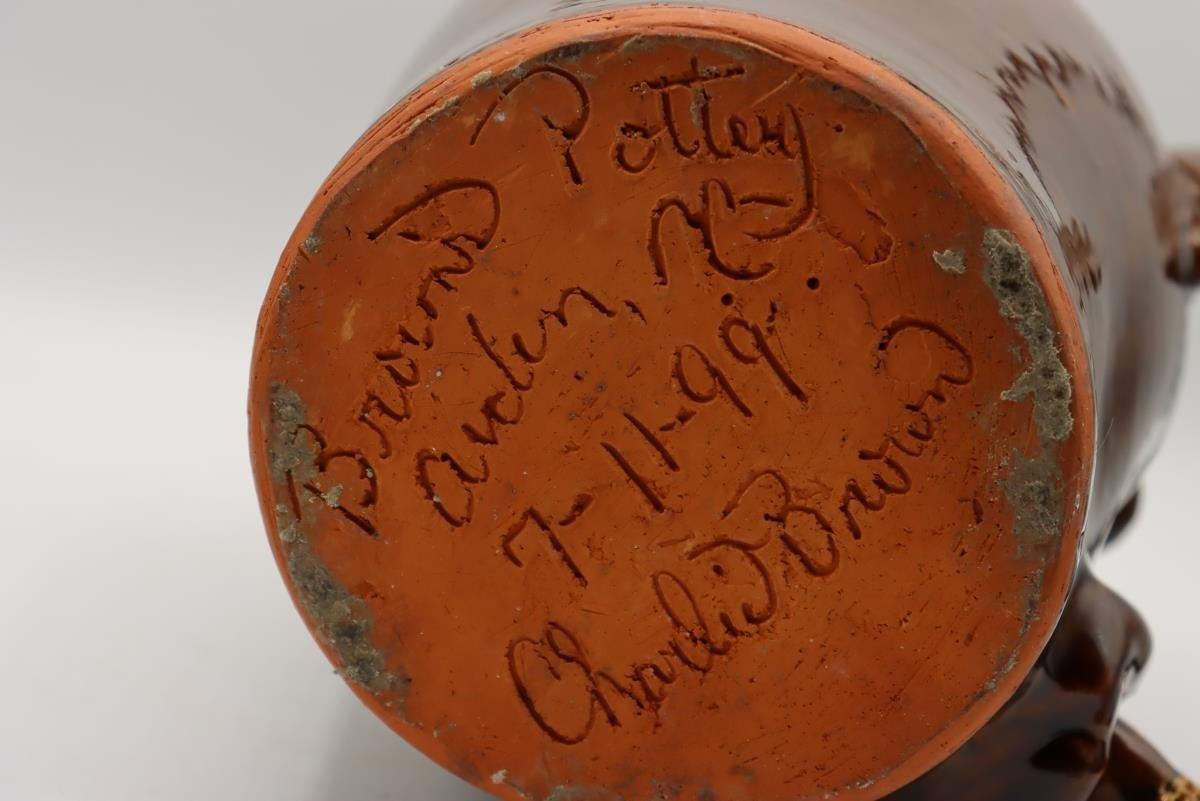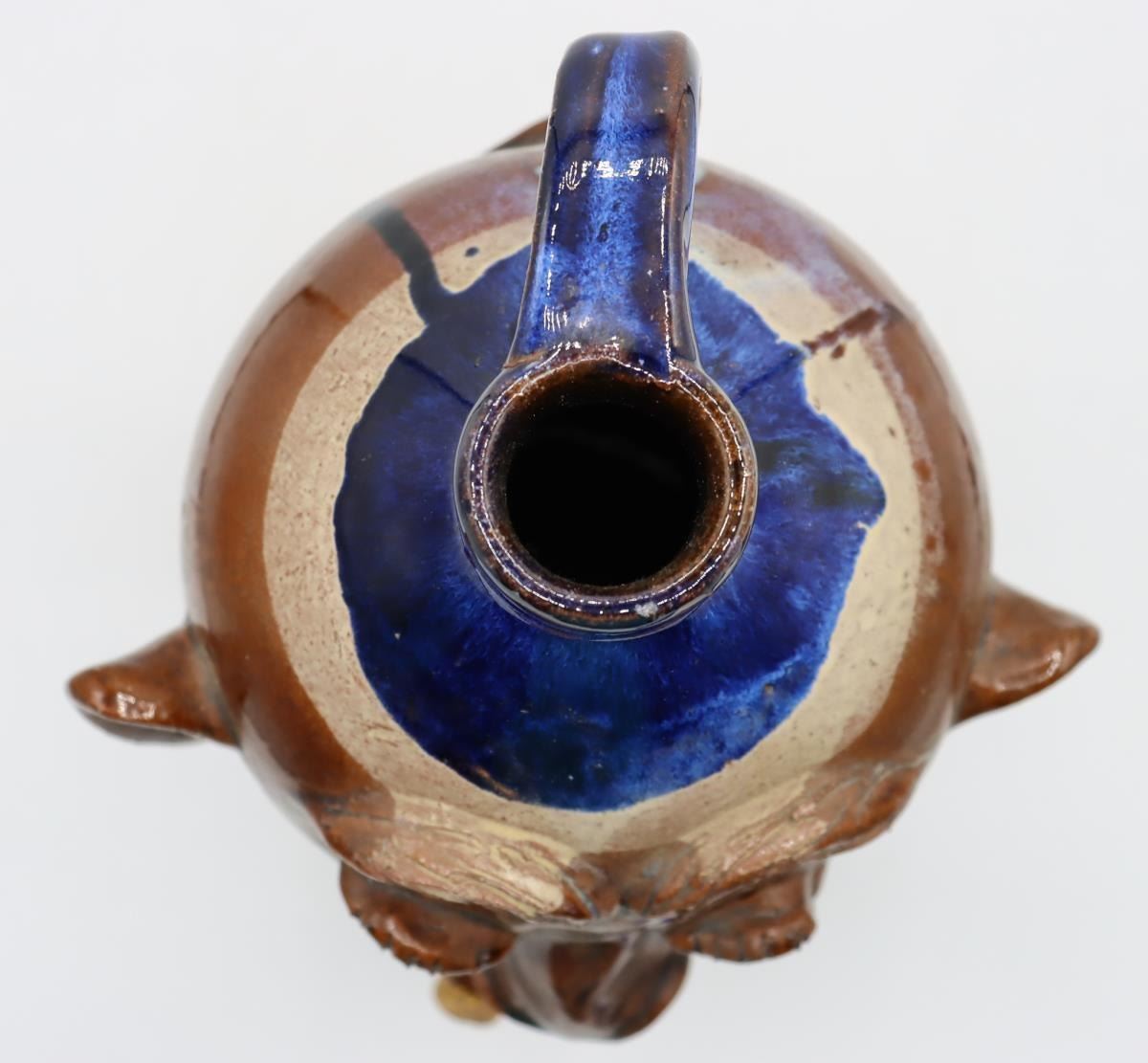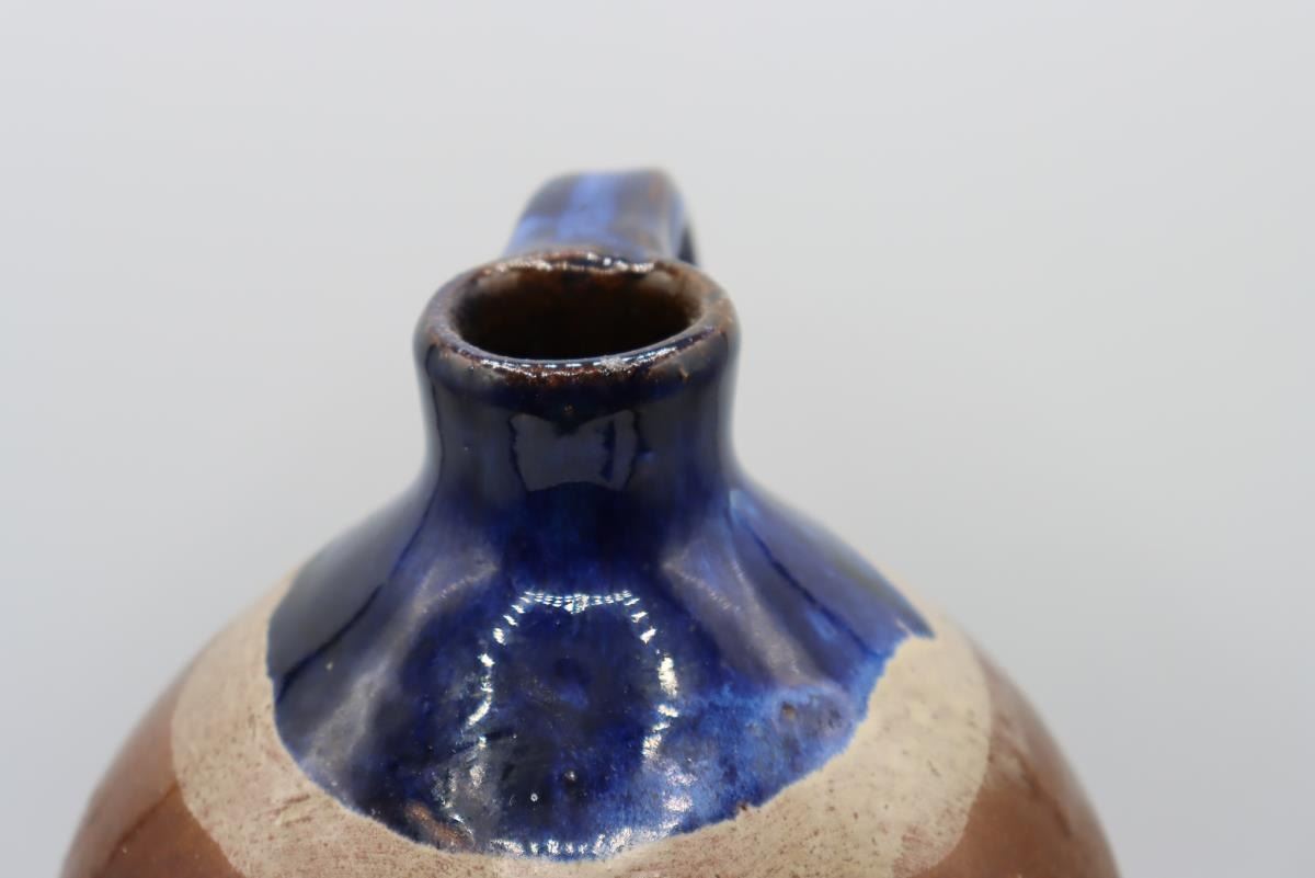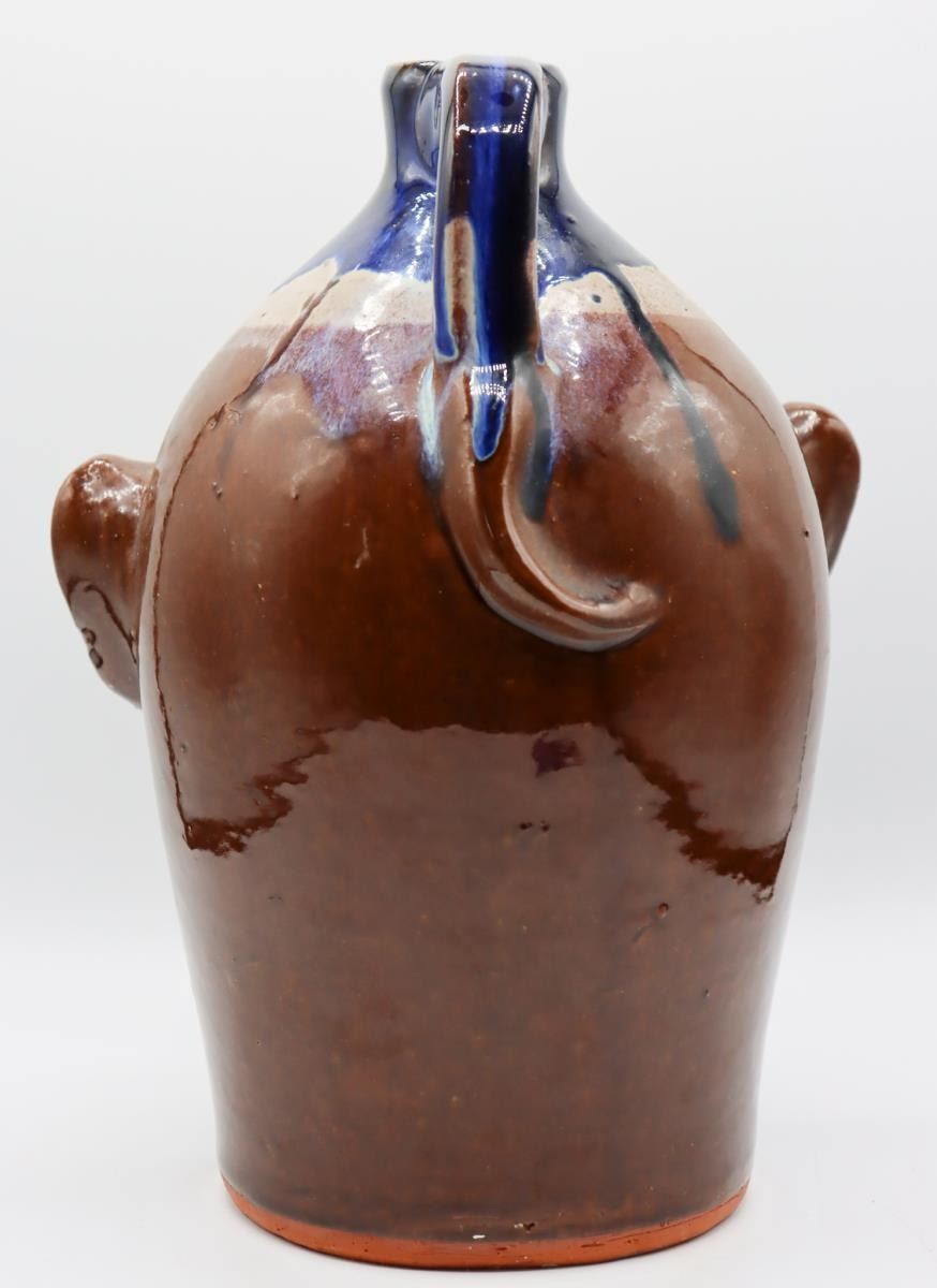 Three colors face jug with cigar (beautiful cobalt blue, white, and tobacco brown glaze. Awesome expression with cigar). Perfect condition.