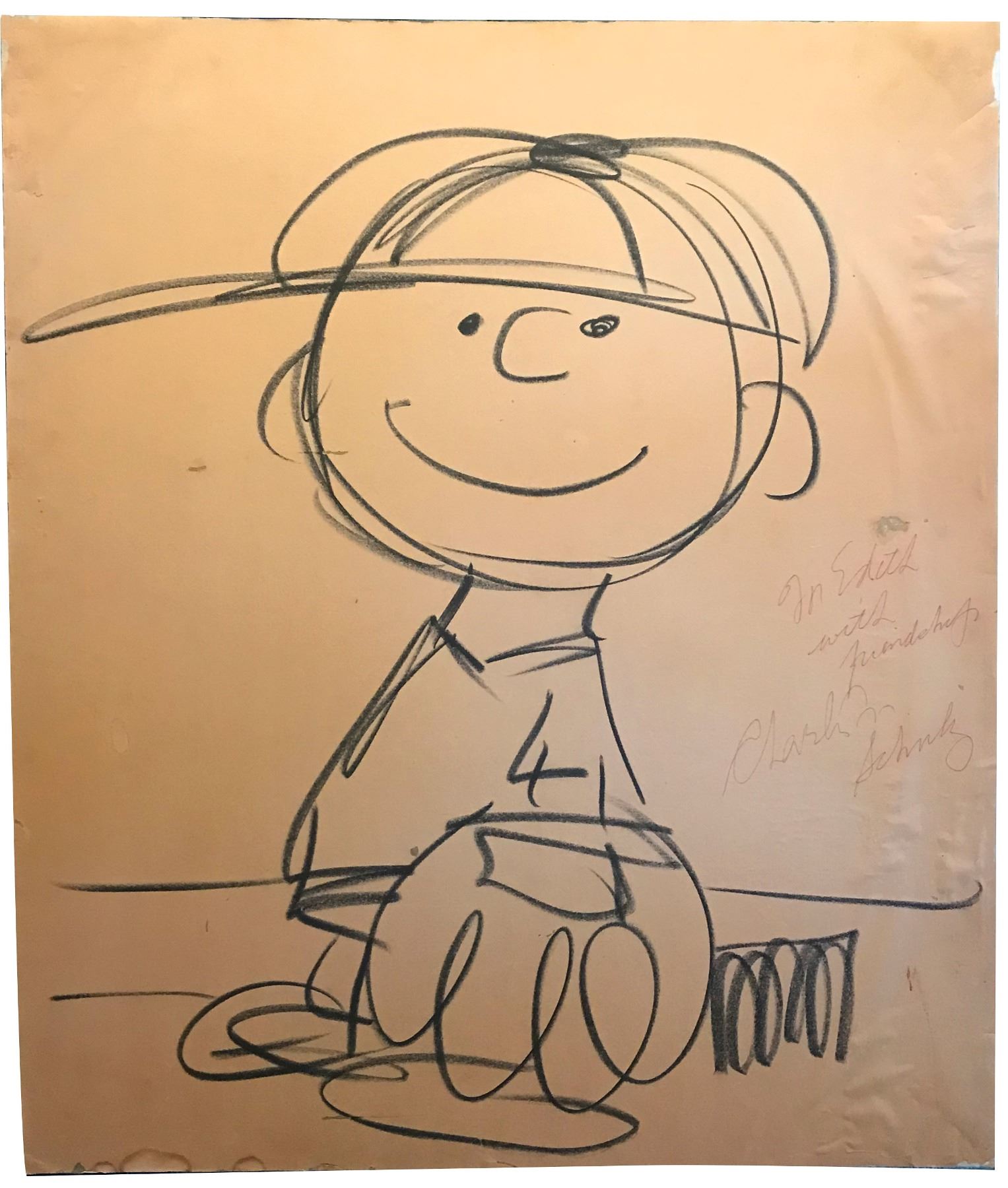 Extremely large vintage circa late 1960s original drawing of Charlie Brown accomplished in black charcoal by Charles Schulz on a huge 30 x 35 board, signed and inscribed on the left side in red felt tip, "For Edith, with friendship, Charles M. Schulz." The massive sketch shows the Peanuts star in his baseball hat and wearing a baseball glove. In very good condition, with small areas of paper loss, staining, and creasing, heaviest to the right side. Consignor notes that this drawing was done during a 1969 seminar at UCLA. Charlie Brown stands an impressive 31 inches tall, making this one of the largest Schulz sketches we have ever seen!