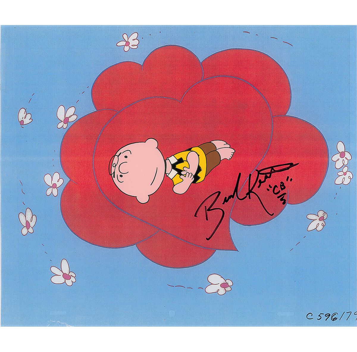 (Bill Melendez Productions, 1977) Original production cel featuring Charlie Brown from Charlie Brown’s First Kiss. The cel is placed on a studio copy background. Image measures 4.5 x 2.25, and shows a smitten Charlie Brown floating over some hearts and flowers, with overall dimensions of 14 x 11, and is signed in black felt tip by Brad Kesten, who voiced Charlie Brown from 1983–1985. In fine condition.