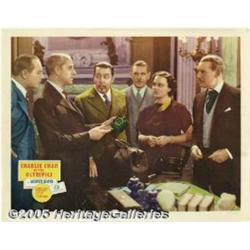 <B>Charlie Chan at the Olympics (20th Century Fox, 1937)</B></I> Lobby Card (11" X 14"). One of the better entries in the long-running series, this film stars Warner Oland as the detective Charlie Chan. Assigned by the U.S. Navy to track down spies who have a secret airplane remote control, Chan travels to Berlin on the Hindenburg. (For the film, the Nazi flag on the tail was erased frame by frame. The dirigible had its famous fiery wreck the week that this film was released.) While watching his #1 son compete for the U.S. swim team (with stock footage of the Berlin Olympics added), Chan hunts the spies and solves a kidnapping and murder. Very slight corner wear and a few scuffs in the image area. Otherwise, a beautifully clean scene card. Very Fine+.