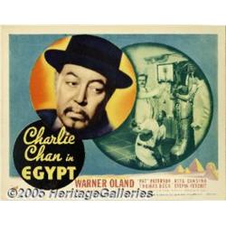 <B>Charlie Chan in Egypt (Fox, 1935).</B></I> Title Card and Lobby Cards (3) (11" X 14"). A top notch horror film and murder mystery all rolled into one makes this one of the best movies in the "Chan" series. There's a mysterious King Tut-like curse, that has befallen an archaeological expedition, and Chan must find the true culprit. Offered in this lot is the Title card and one of the scene cards, each featuring a great image of Oland. The title card has a couple of pinholes, one in the border and one in the background graphics. Very Fine. The scene card has three pinholes, two in the graphics and one on the top border, a light scuff mark, and some small border smudges. Fine/Very Fine. 2 items