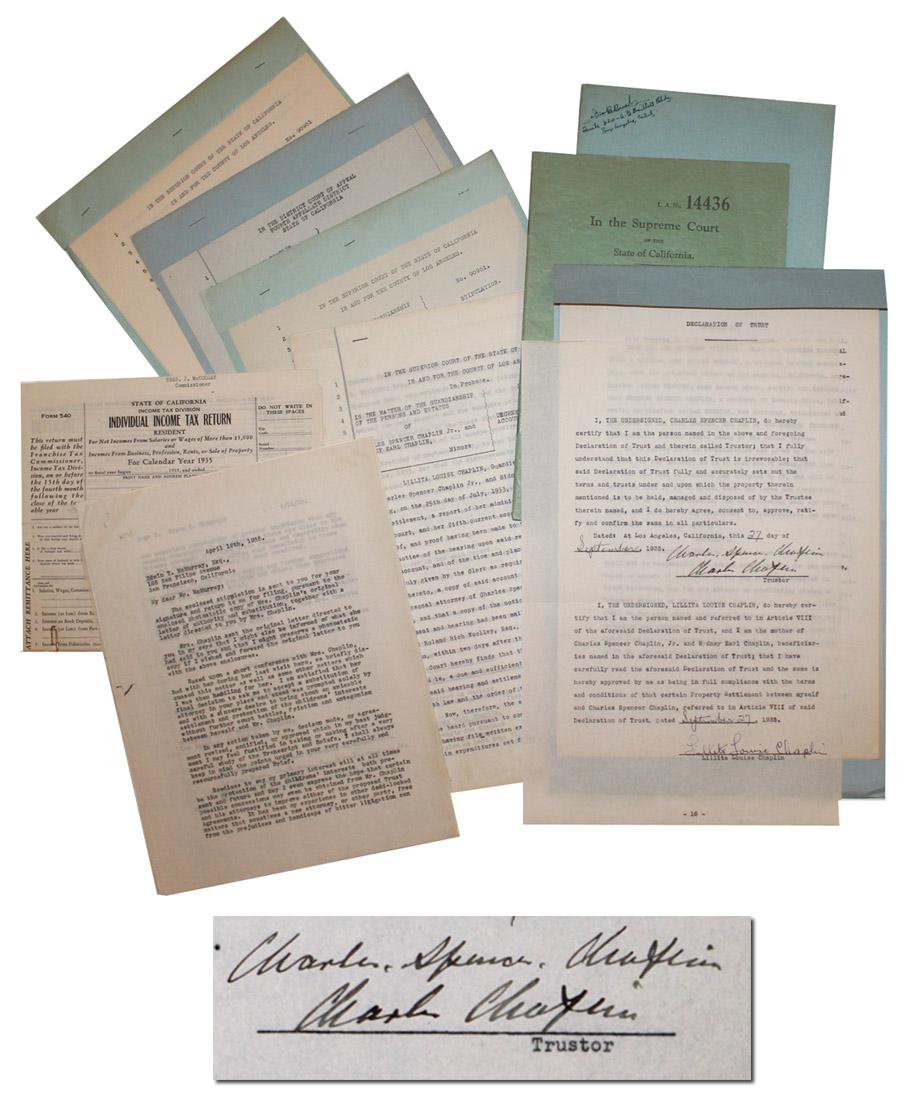 Riveting collection of over 25 legal documents regarding Charlie Chaplin’s divorce from Lita Grey, including Chaplin's 1935 Statement of Income, numerous letters by Grey and the cornerstone of the lot, a ''Declaration of Trust'' for the couple's two children, twice signed by Chaplin, ''Charles Spencer Chaplin'' and ''Charles Chaplin'' establishing a $100,000 trust fund for each of their two children. The lot overall is a fascinating page-turner, with Grey staking her claim to Chaplin's fortune through letters such as this one dated 22 April 1935: ''…leave no stone unturned as far as the delving into records is concerned---- as well as the study of the psychological phases of the case. My dealings with Mr. Chaplin up to the present time have been anything but pleasant…I think that even he, at this time, would agree--- that I am right in expecting the trust agreement to read very much in favor of the children…I am not, at this time, expecting him to play me a dirty trick…'' Lot also includes numerous legal and financial documents examining Chaplin's personal finances, stock portfolio and property investments. In 1924, Chaplin secretly married the 16-year old Grey in Mexico, but they divorced three years later on grounds that he was having affairs with several other women. The 1927 Chaplin-Grey divorce proceedings was a media sensation with the divorce settlements the largest ever. Chaplin was forced to pay a then-unheard of $600,000 lump sum to Grey and establish $100,000 trust funds for each of their two children. Lot is in very good condition with the 16pp., 8.5'' x 13'' trust agreement in near fine condition; signatures are bold and clear and paper has been nicely preserved. An extraordinary archive of Hollywood memorabilia.