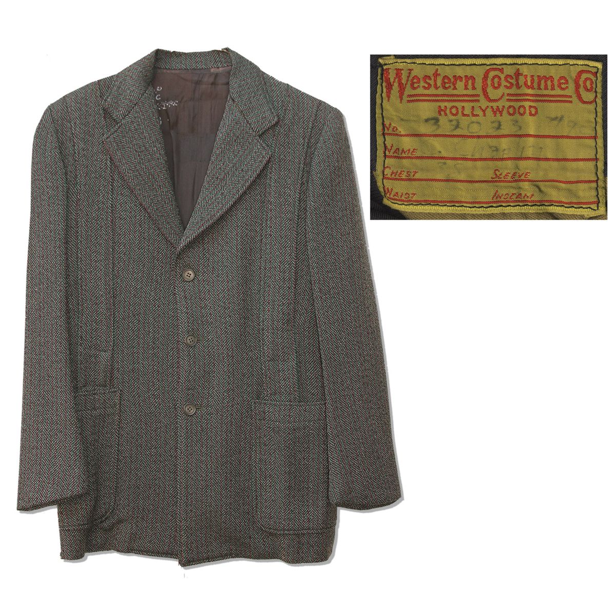 Charlie Chaplin screen worn costume from ''Monsieur Verdoux'', Chaplin's controversial dark comedy. Wool Norfolk-style jacket features a herringbone-like pattern in red, green, black and white. With a Western Costume tag sewn into the interior pocket, labeled, ''C. Chaplin'' with production numbers. Measures 19'' across the chest. White hand-labeling to lining. Belt is lacking, else jacket is in near fine condition.