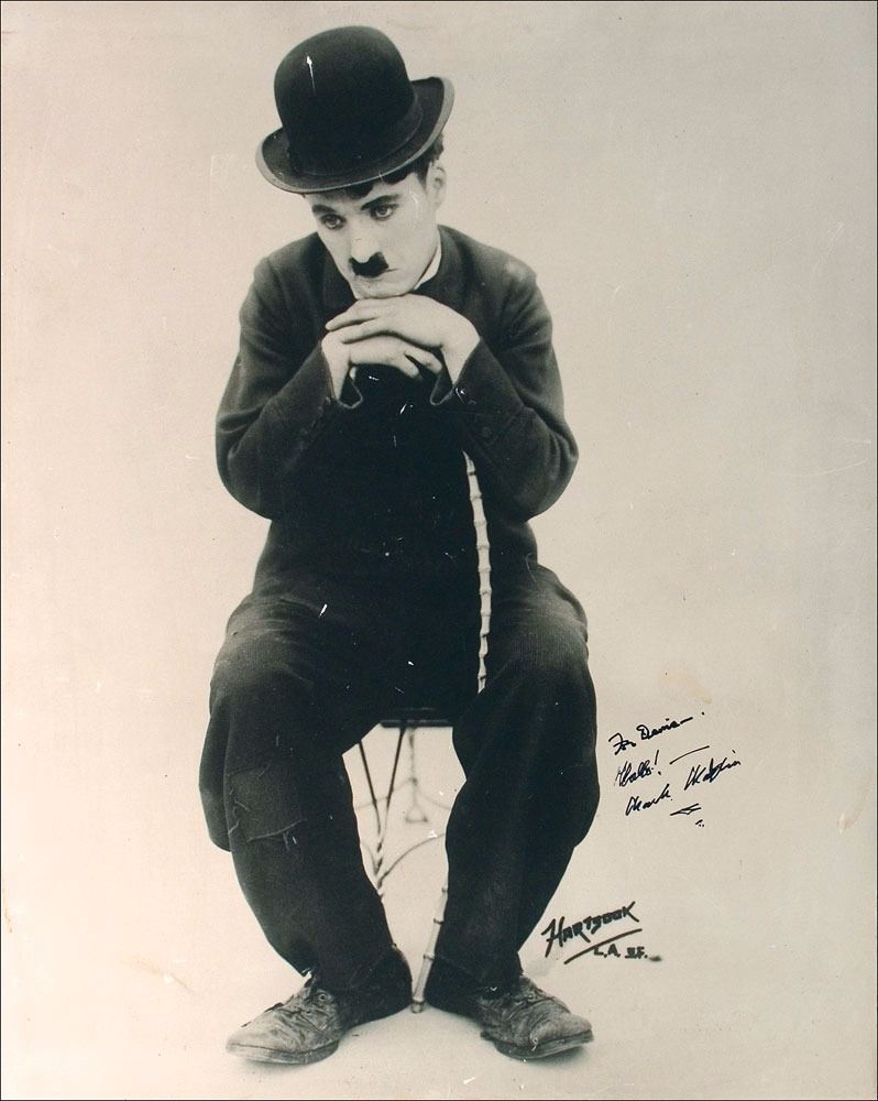 Marvelous oversized matte-finish 16 x 20 reproduced Hartsook portrait of The Tramp looking rather melancholic and desolate, signed and inscribed in his elder years with a modern-day flair pen, "For Daria, Hello! Charlie Chaplin." In very good to fine condition, with some scratches, creases, and small areas of surface emulsion loss. A most impressive image and incredibly desirable portrayal of Chaplin as his most famous character.