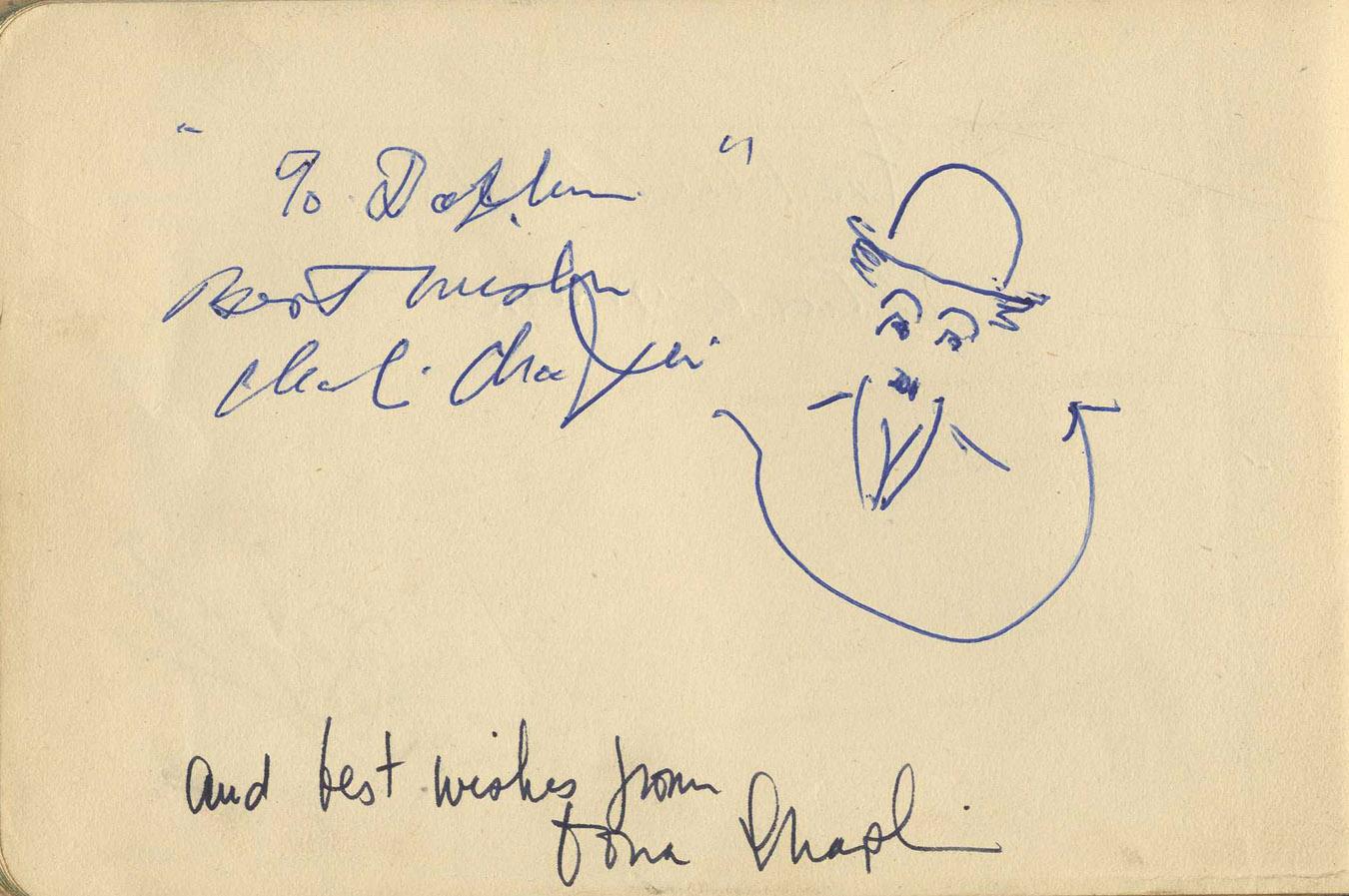 Excellent Charlie Chaplin signature and sketch of his most famous silent film character, ''The Tramp.'' Here, Chaplin signs his name in an autograph book with various signatures on each of the pages. Signed and inscribed in blue ink: ''To Daphne / Best Wishes / Charlie Chaplin'' with a nice 2'' drawing by Chaplin of The Tramp. Signed page measures 6.25'' x 4'' and is bound in a 6.5'' x 4.5'' maroon leather booklet. Pages are worn from age and a few pages have become detached. Signature page is in very good condition.