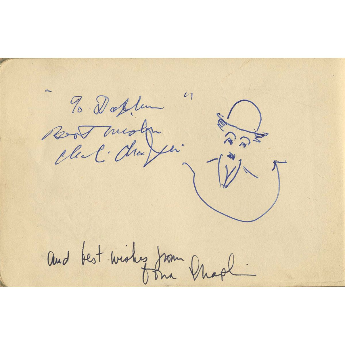 Excellent Charlie Chaplin signature and sketch of his most famous silent film character, ''The Tramp.'' Here, Chaplin signs his name in an autograph book in blue ink: ''To Daphne / Best Wishes / Charlie Chaplin'' with a nice 2'' drawing by Chaplin of The Tramp. Signed page measures 6.25'' x 4'' and is bound in a 6.5'' x 4.5'' maroon leather booklet. Dozens of other signatures appear in the book, including that of Tyrone Power on the verso of Chaplin's page. A few pages have become detached. Chaplin signature page is in very good condition.