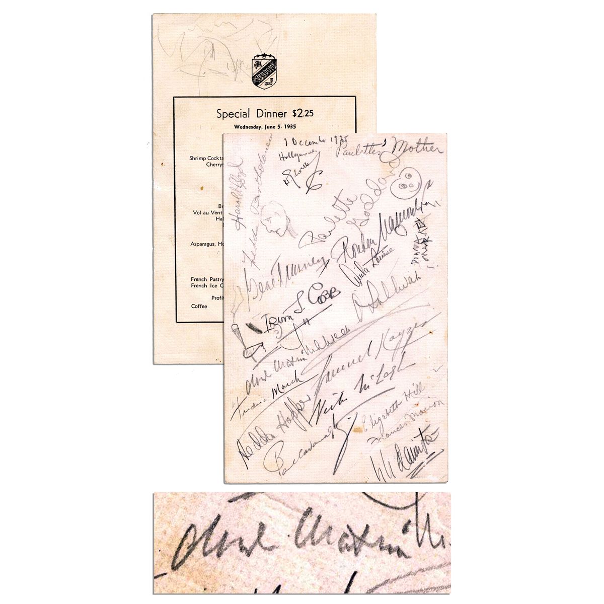 Charlie Chaplin signature upon the verso of a restaurant menu, also signed by several celebrities of the time. Printed menu from The Vendome is for 5 June 1935. Chaplin signs in pencil along with Gene Tunney, Frederic March, Harold Lloyd, Hedda Hopper, Paulette Goddard, Freddie Bartholomew and others. Measures 6'' x 9.5.'' In very good condition.