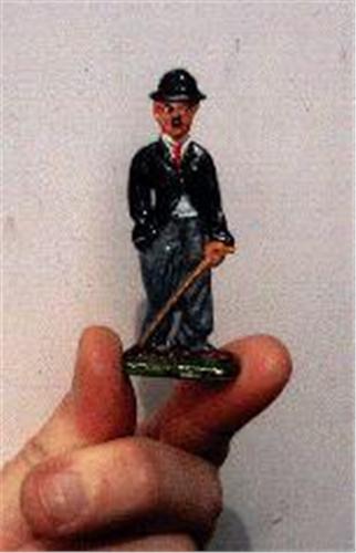 Charlie Chaplin. Vintage miniature metal figure of the "Little Tramp," 23/4" high, lead. Dressed in his trademark outfit of baggy pants, shrunken coat, derby, and cane. 1930s. Colorful and choice.
