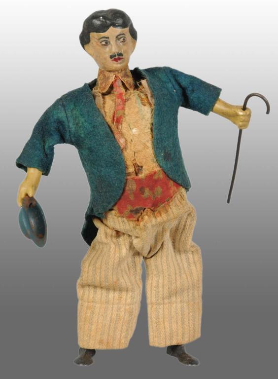 American. Circa 1918. Composition head, original clothing, and cast metal shoes or feet. Small label sewn on back of jacket reads “Ferguson Novelty Co. New York.” Charlie is holding a cane in one hand and a cigar or cigarette in the other. Jacket is slightly faded with some soiling on back, minor cracking on both sides of head near ear and slight chipping to hat. Rare toy. Collection of Carl Lobel. Condition (Very Good). Size 9 - 1/4" T.