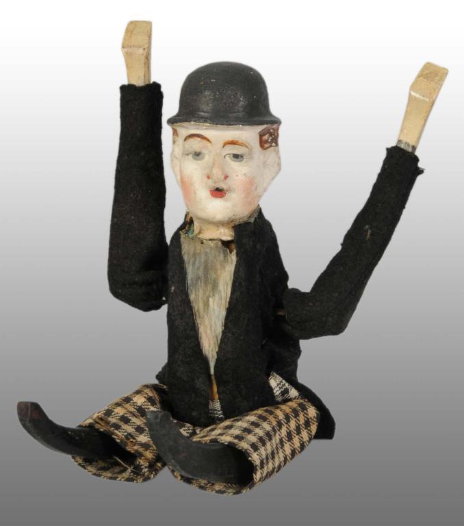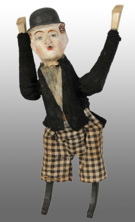 American. Circa 1918. Probably made by the Ferguson Company. Working. Composition head, cloth dressed and curved wooden legs to facilitate tumbling action. Turning arms activates the wind-up mechanism and Charlie tumbles forward, head-over-heels. Slight soiling to front of pants. Very unusual toy with great action. Collection of Carl Lobel. Condition (Excellent). Size 9" L.