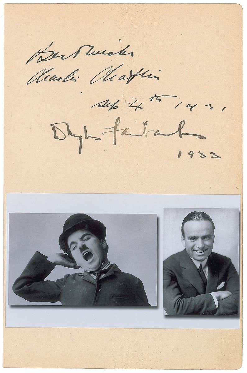 Desirable fountain pen signatures, "Best wishes, Charlie Chaplin, Sep 4th 1931" and "Douglas Fairbanks, 1933," on an off-white 6.25 x 9.5 album page bearing an affixed modern photo of the two stars. In fine condition.