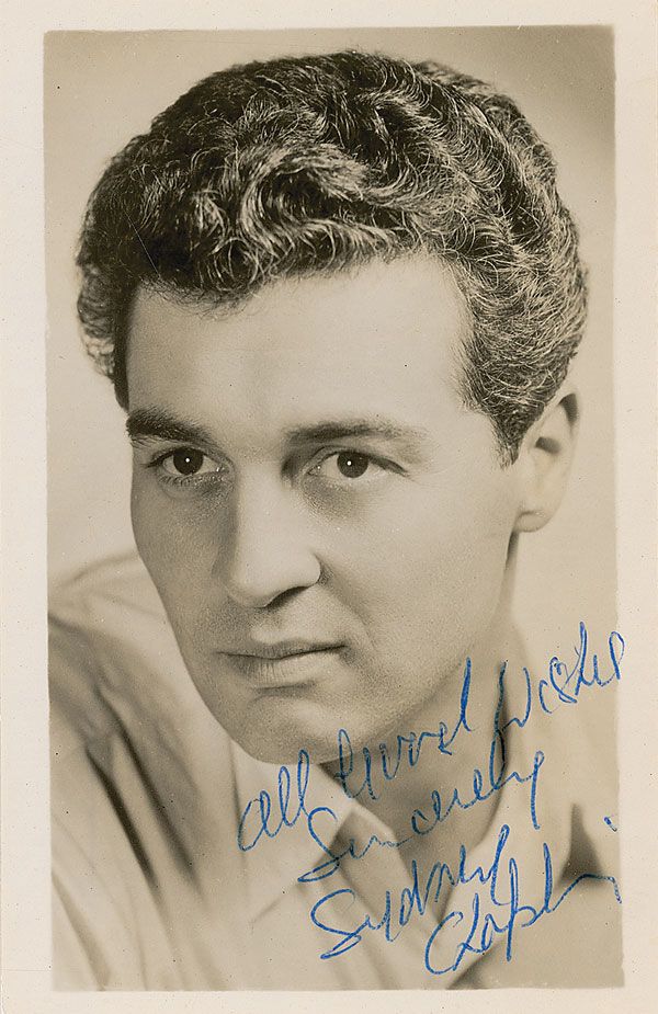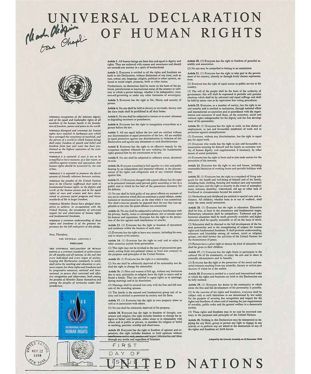 Souvenir typescript of the Universal Declaration of Human Rights, 8.25 x 11, bearing a first day postmark at the bottom, signed in the upper left in black felt tip by Charlie Chaplin and Oona Chaplin. Also included is a 3.5 x 5.25 real photo postcard of Sydney Chaplin, signed in blue ballpoint, “All good wishes, Sincerely, Sydney Chaplin.” In overall fine condition.