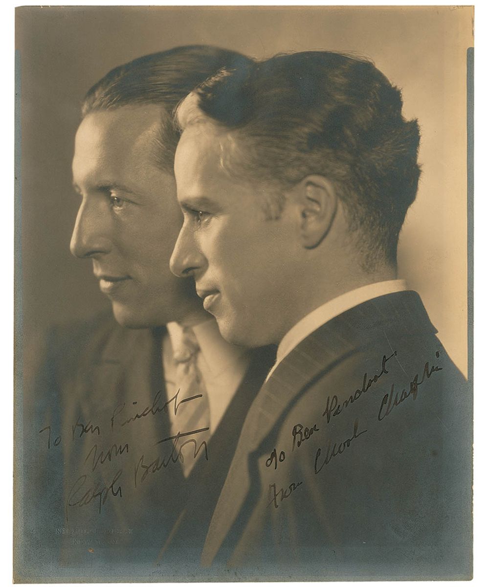 Vintage matte-finish 8 x 10 portrait by Nickolas Muray, signed and inscribed in fountain pen “To Ben Pinchot, from Charles Chaplin” and “To Ben Pinchot, from Ralph Barton.” Affixed to a same-size cardstock mount. In very good condition, with some light spotting to the finish, moderate silvering to the borders and dark areas of the image, light contrast to the inscriptions and signatures, and lightly trimmed edges. Pinchot was a renowned theatrical photographer.