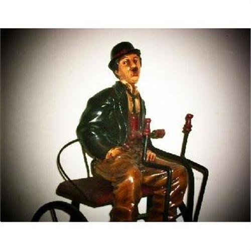 This splendid, finely handmade figure of the famous English comedic actor, "Charlie Chaplin" riding his three wheeled tricycle. This is a one of a kind figure because of its uniqueness and great display aspect. The three wheeled tricycle can actually move with its wheels and is custom made of steel to fit Charlie's sitting posture. Please feel free to ask any questions regarding this beautifully made Charlie Chaplin figure!)