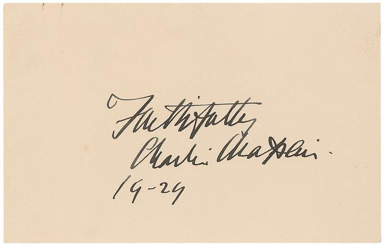 Bold vintage fountain pen signature, “Faithfully, Charlie Chaplin 19–29,” on an off-white 5.5 x 3.5 slip. In fine condition, with light paperclip mark to top edge.