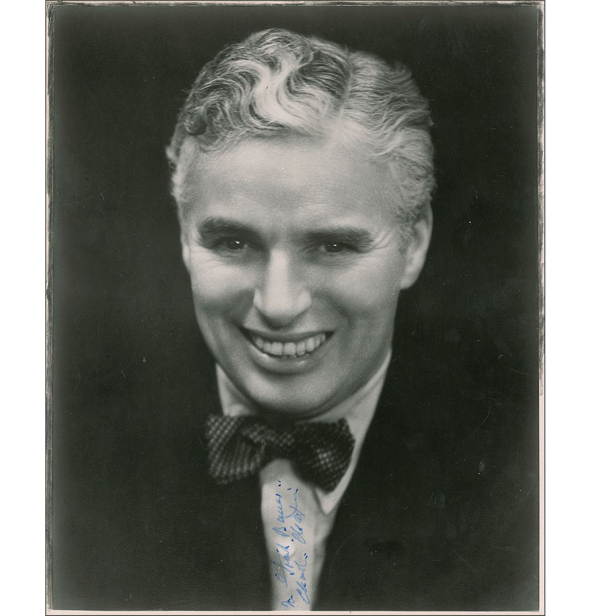 Jovial vintage glossy 7.75 x 9.5 head-and-shoulders photo of Chaplin in a suit and bow tie, signed and inscribed in fountain pen, “To Frank Bauer, Charlie Chaplin.” In very good condition, with scattered light creasing and trimmed edges.