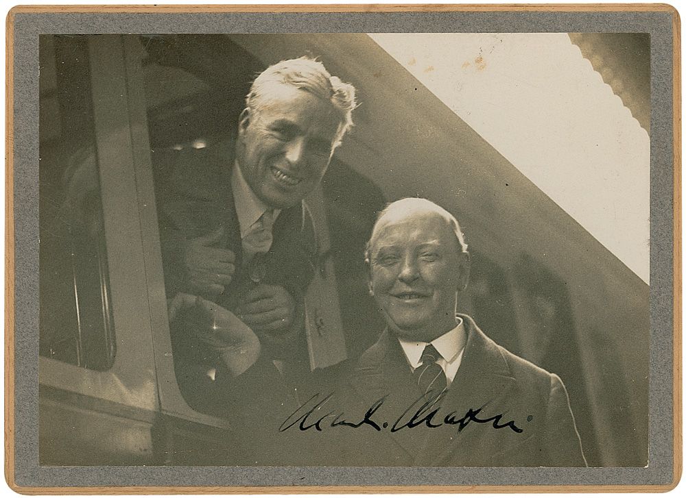 Terrific vintage glossy 5.75 x 4 photo of Chaplin leaning out a train window next to Jack Fitchett, manager of The Palace Theatre, mounted to a slightly larger board and signed in fountain pen, “Charlie Chaplin.” In fine condition, with scattered light surface marks and impressions, and a few trivial spots of soiling. A friend of Chaplin’s, Fitchett performed alongside the comedian in the 1929 film, The Mumming Birds.