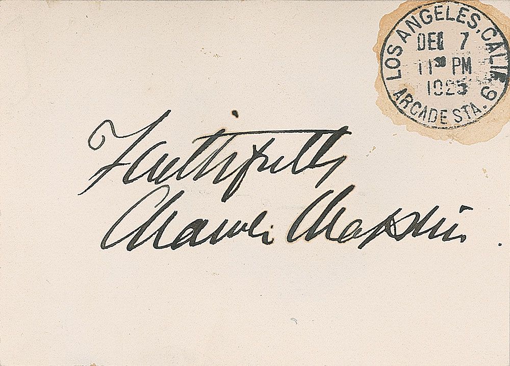 Vintage ink signature, “Faithfully, Charlie Chaplin,” on an off-white 3.25 x 2.5 card with a clipped December 7, 1935, Los Angeles postmark affixed to top right. In fine condition, with a few light bends and creases, and mounting remnants to reverse from