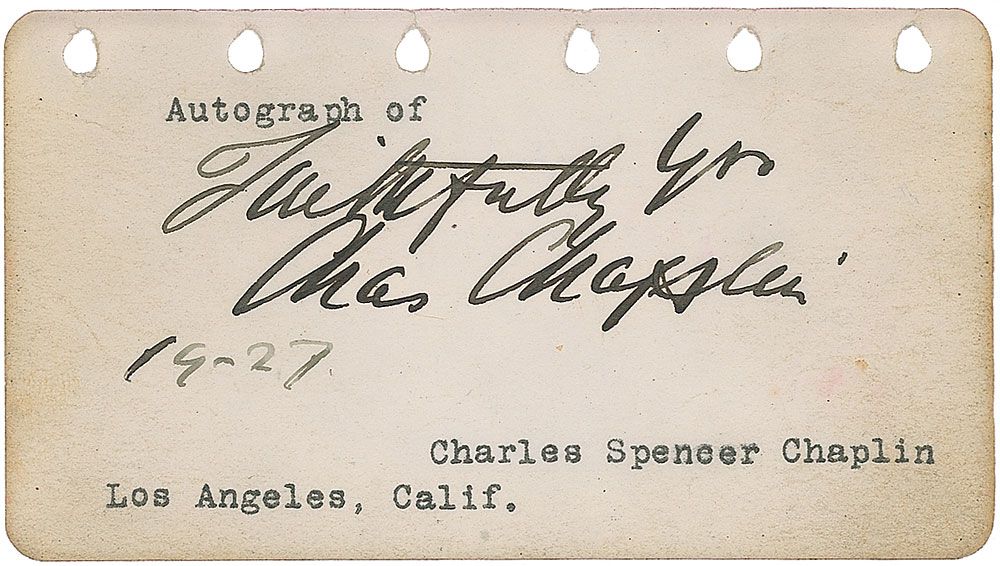 Bold vintage fountain pen signature, “Faithfully yours, Chas. Chaplin,” on an off-white 4.5 x 2.5 page. In fine condition, with mild toning to three edges.