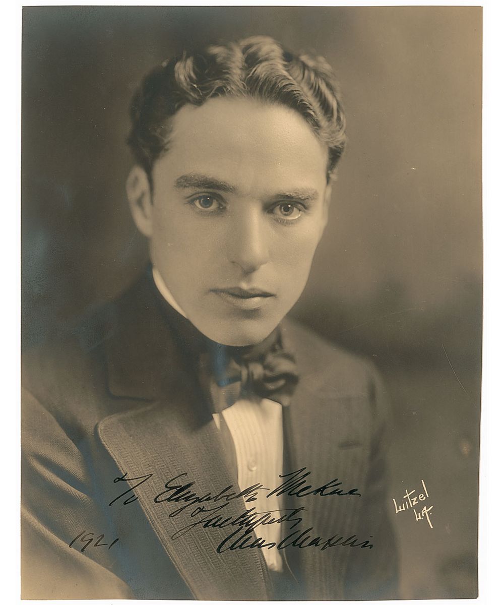 Vintage matte-finish 7 x 9 photo of a young Chaplin in a tuxedo, signed and inscribed in fountain pen, “To Elizabeth Mekue, Faithfully, Chas Chaplin 1921.” In fine condition, with slightly trimmed edges and a few small areas of light silvering (visible only at an angle).