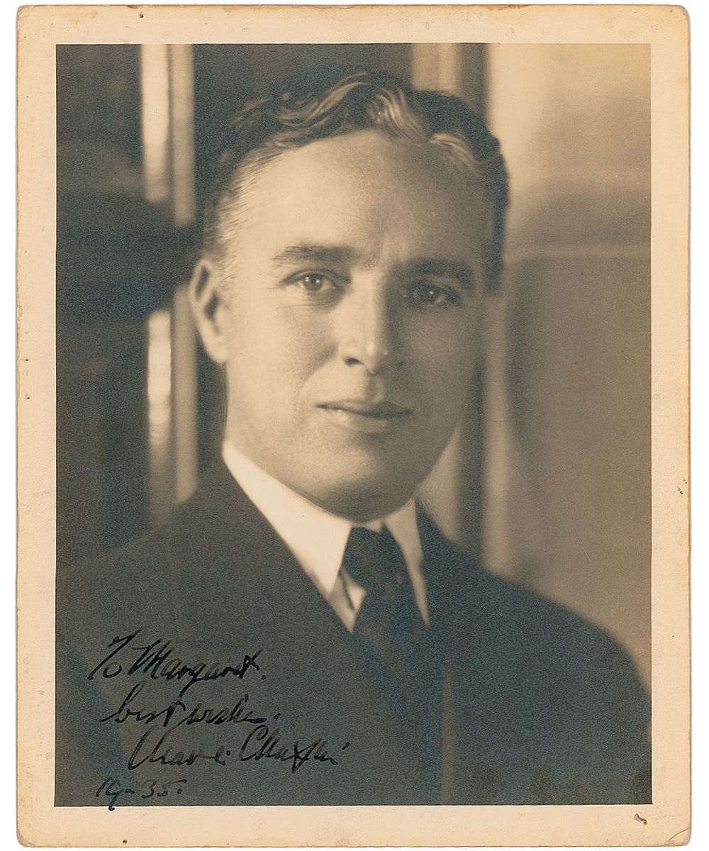 Vintage matte-finish 8 x 10 photo of Chaplin looking distinguished in a dark jacket and tie, signed and inscribed in fountain pen, “To Margaret, best wishes, Charlie Chaplin, 1935.” A single tack and staple hole to borders, as well as some mild border foxing and creases, and a bit of light silvering to darker areas, visible only at an angle, otherwise fine condition.