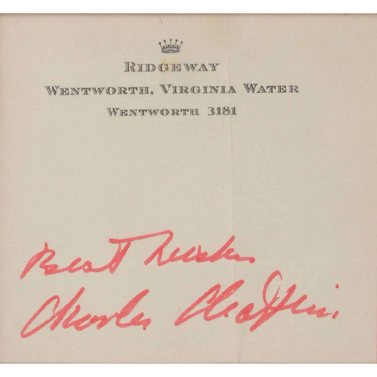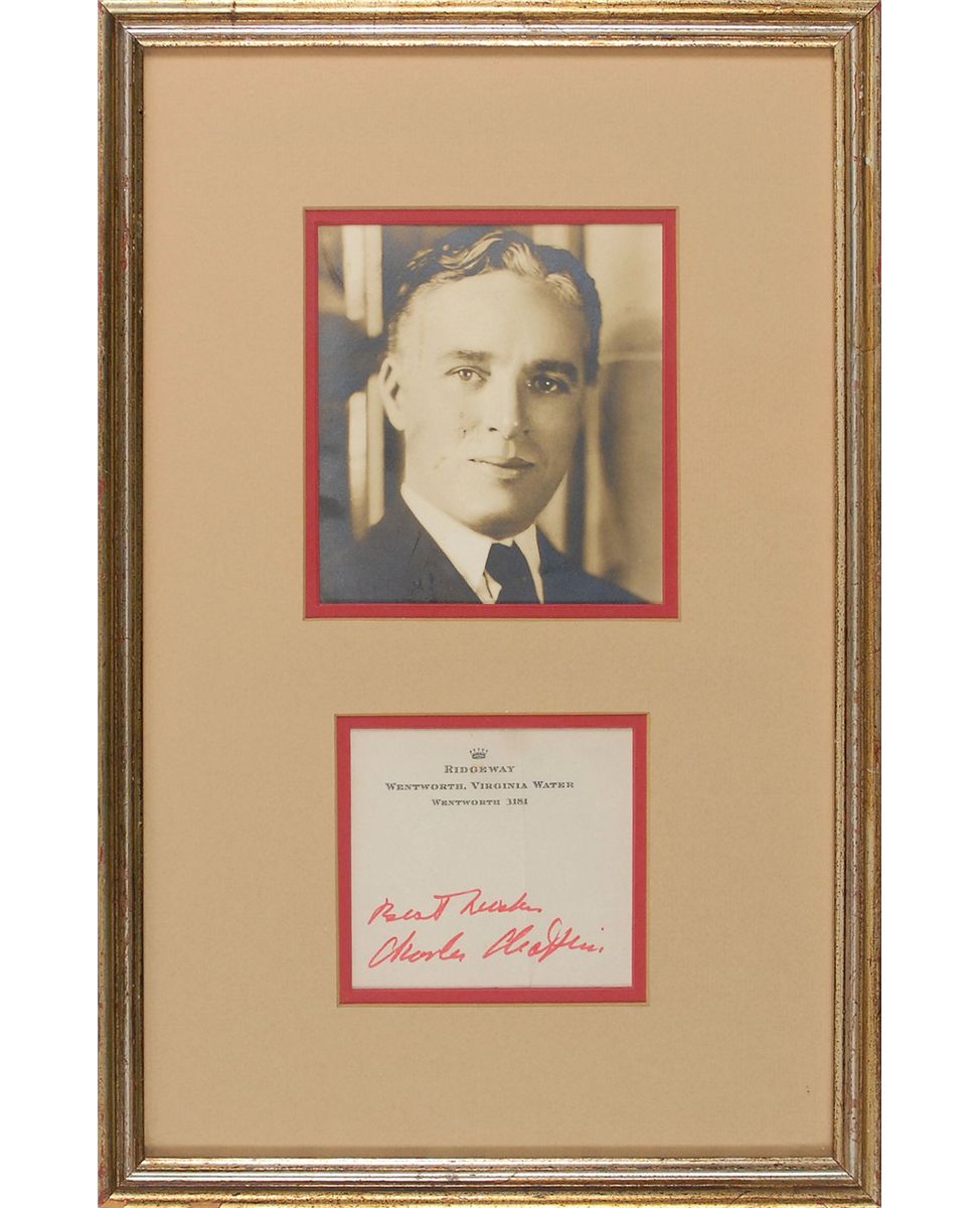 Felt tip signature, “Best wishes, Charles Chaplin,” on an off-white sheet of Ridgeway, Wentworth, Virginia Water stationery. Double-matted and framed with a portrait of Chaplin to an overall size of 9.75 x 15.25. In fine condition, with intersecting folds, one through a single letter of signature.