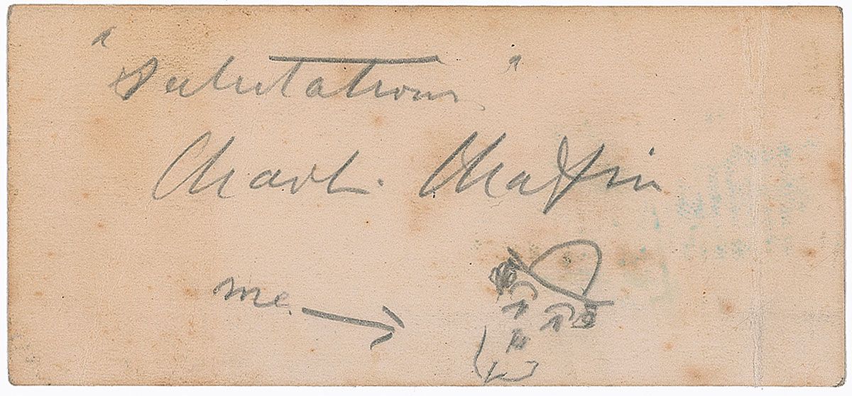 Original vintage signed pencil self-portrait of his instantly-recognizable Little Tramp character on an off-white 4 x 1.75 card, signed in pencil, “‘Salutations,’ Charlie Chaplin,” adding “me” with an arrow drawn to the sketch. In very good condition, with scattered foxing and soiling, and a crease to the right edge. An exceptionally rare and desirable sketch the by iconic actor of his signature character.