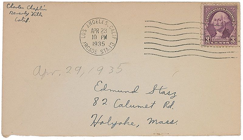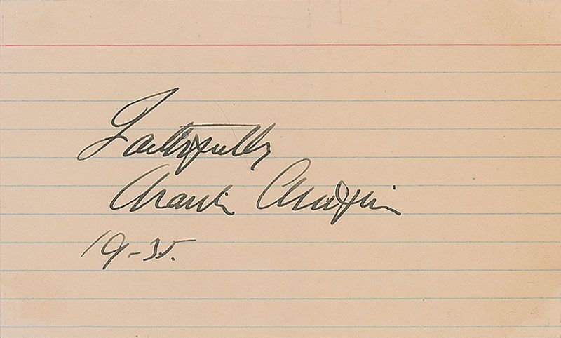Choice fountain pen signature, “Faithfully, Charlie Chaplin, 1935,” on an off-white 5 x 3 lined card. In fine condition. Accompanied by the original mailing envelope.