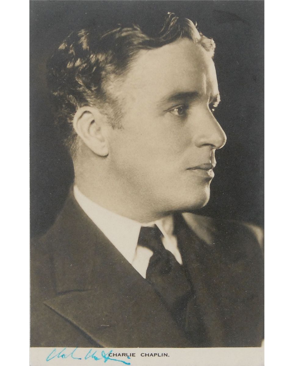 Handsome crystal-clear 3.25 x 5.25 postcard photo of Chaplin in profile, signed in the thin lower border in blue ink. Nicely matted and framed with an image of Chaplin in his ‘tramp’ role to an overall size of 18.5 x 13. In fine condition.