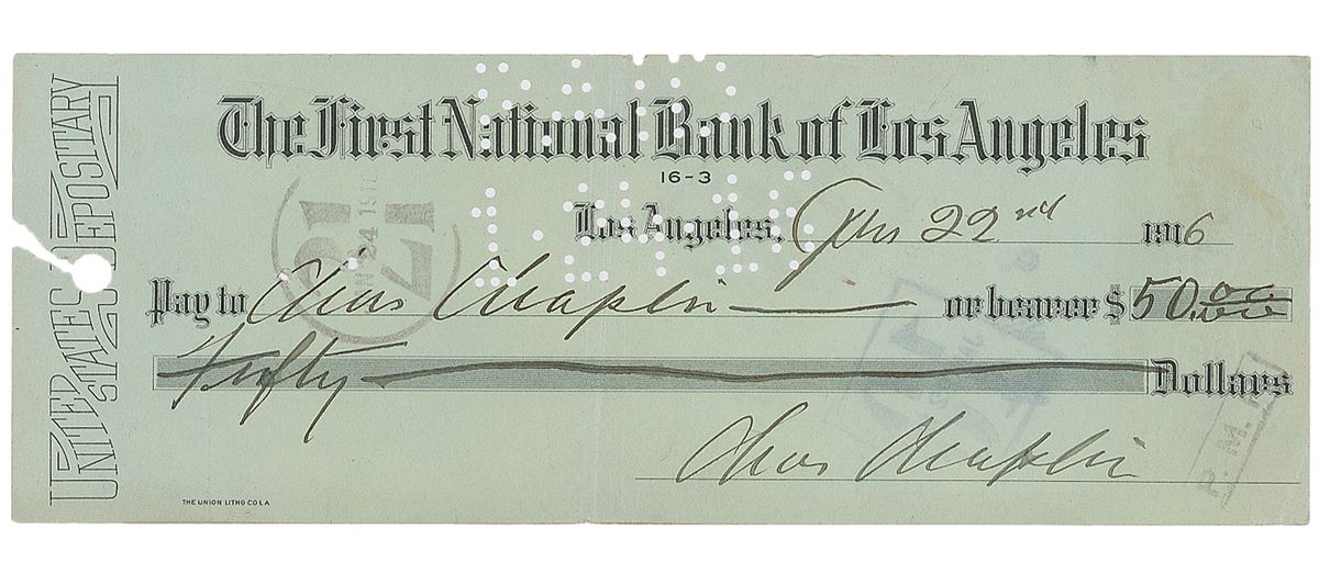 Rare First National Bank of Los Angeles check, 8.25 x 3, filled out and signed by Chaplin, “Chas. Chaplin,” payable to himself, “Chas. Chaplin,” for $50, January 22, 1916. Central vertical fold, expected cancellation holes (slightly affecting the top of his signature in the payee field), and a subtle stain to the upper right, otherwise fine condition. In addition to its very early date, this is the only Chaplin check we have ever offered—his debut in film came in 1914, and 1915 marked his emergence as a cultural phenomenon with the release of The Tramp. His popularity quickly exploded as he became the film industry’s first international star, and his contract with Essanay Studios expired at the end of the year. At the start of 1916 Chaplin was being courted by nearly every film studio, including Universal, Fox, and Vitagraph—soon, money would be no object. Just a month after writing this check, on February 27, 1916, he accepted an offer from the Mutual Film Corporation, guaranteeing him a whopping $670,000 per year to make him one of the highest-paid people in the world.