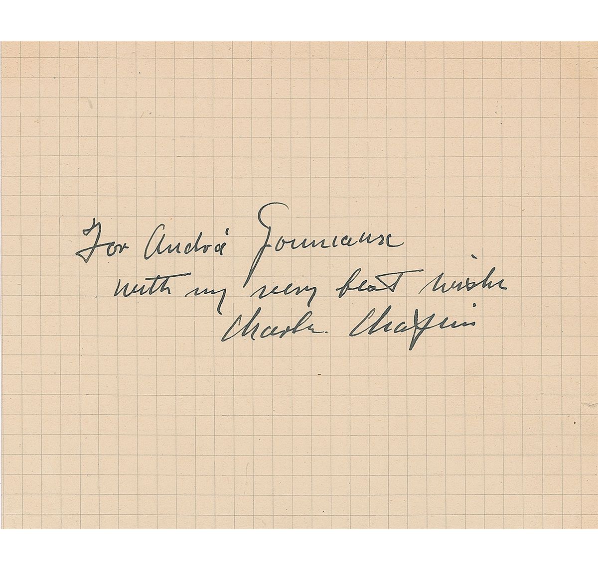 Bold vintage fountain pen signature and inscription, “For Andre Journaux, with my very best wishes, Charlie Chaplin,” on an off-white 6 x 5 gridded album page. In fine condition. An especially dark, crisp example of Chaplin’s autograph.