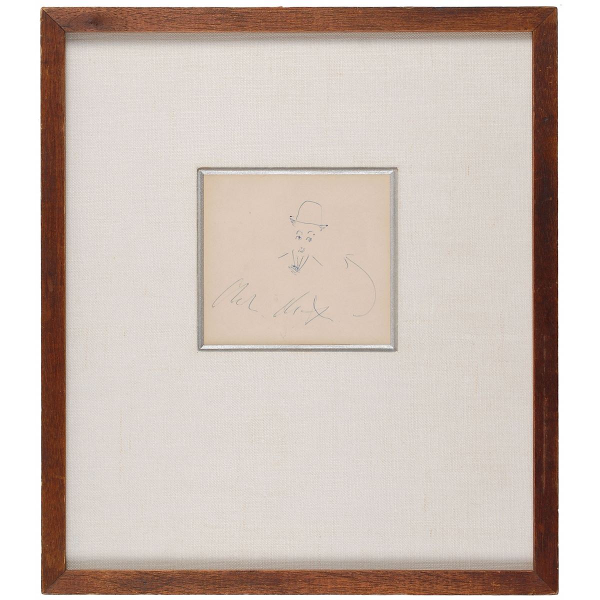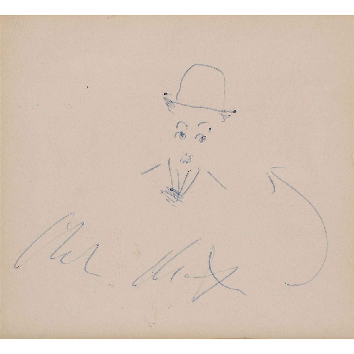 Fabulous ballpoint self-portrait sketch of his instantly recognizable ‘Little Tramp’ character an off-white 4 x 3.75 sheet, signed at the bottom, “Charlie Chaplin,” adding an arrow pointing to the sketch. Handsomely cloth-matted and framed to an overall size of 11 x 12.5. In fine condition, with slight soiling near his last name. A scarce and exceptionally desirable sketch by the iconic actor of his signature character.