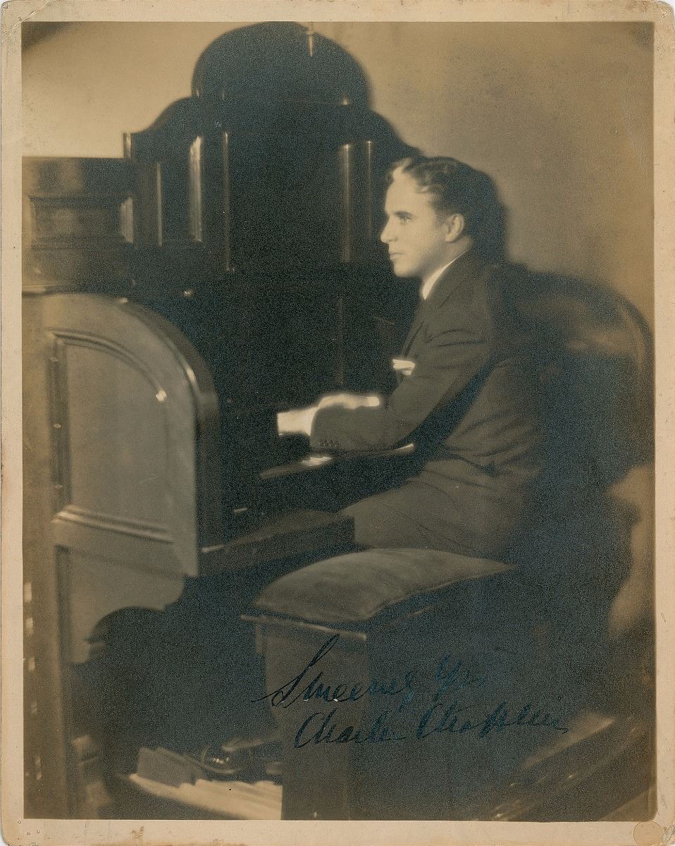 Vintage matte-finish 8 x 10 full-length profile portrait of Chaplin seated an an organ, signed in fountain pen, “Sincerely yrs, Charlie Chaplin.” Reverse bears an affixed Chaplin Studios caption dated June 1929. In very good to fine condition, with pin holes to corners and scattered overall soiling and light silvering. An appealing and unusual pose of the influential filmmaker.