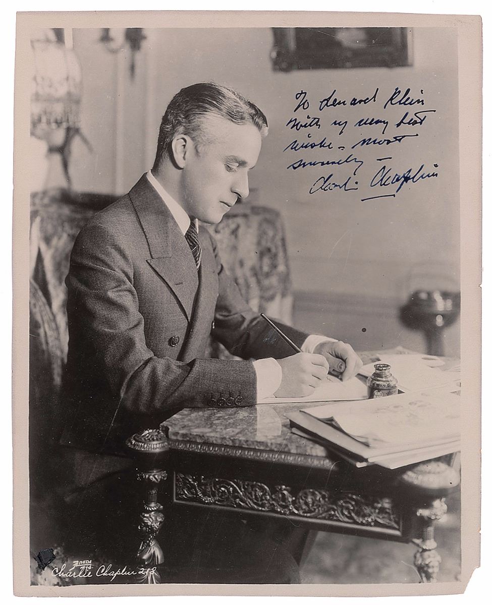 Vintage glossy 8 x 10 Apeda photo of Chaplin writing at his desk, signed and inscribed in fountain pen, “To Leonard Klein, with my very best wishes & most sincerely—Charlie Chaplin.” In fine condition, with a missing lower right corner tip, and a small tear to the top edge.