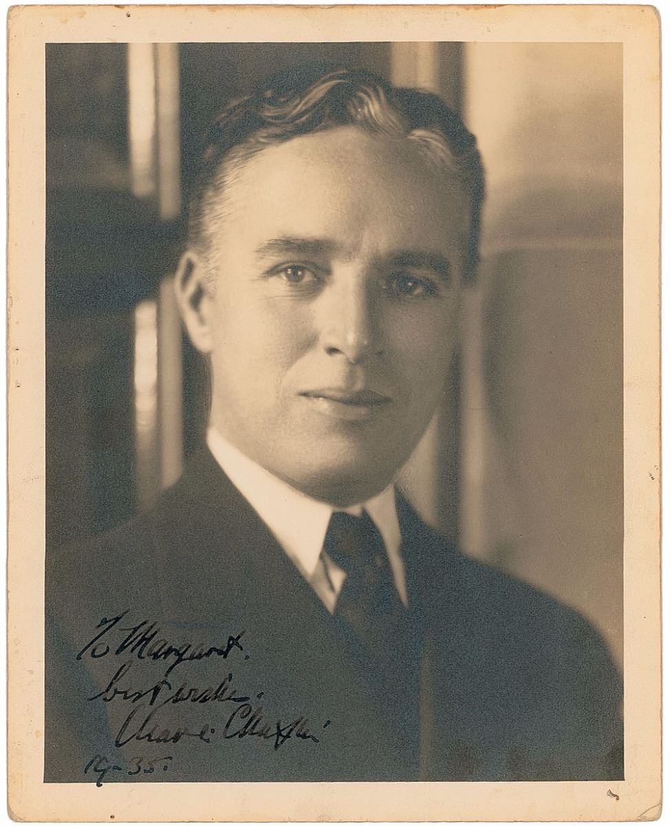 Vintage matte-finish 8 x 10 head-and-shoulders portrait of Chaplin in a distinguished suit and tie, signed and inscribed in fountain pen, “To Margaret, best wishes, Charlie Chaplin, 1935.” A single tack and staple hole to borders, as well as some mild border foxing and creases, and a bit of light silvering to darker areas, visible only at an angle, otherwise fine condition.