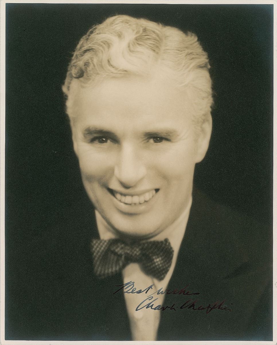Striking vintage matte-finish 7.75 x 9.75 portrait of Chaplin wearing a bow tie, signed in fountain pen, “Best wishes, Charlie Chaplin.” In fine condition, with some light contrast to signature against the dark background.