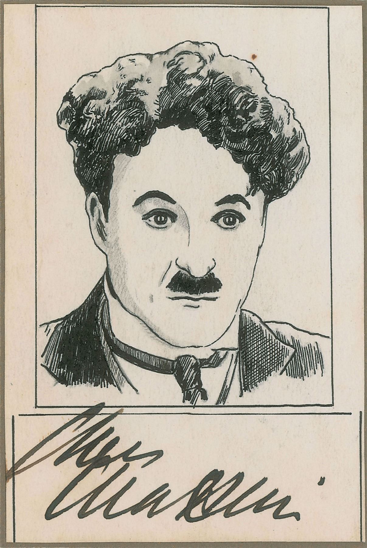 Vintage ink signature, "Chas. Chaplin,” on an off-white 2.75 x 4 sheet bearing an excellent pen and ink and graphite portrait of his famous Tramp character, extremely well-executed by a talented fan. Sheet is affixed to a same-size card. In fine condition.