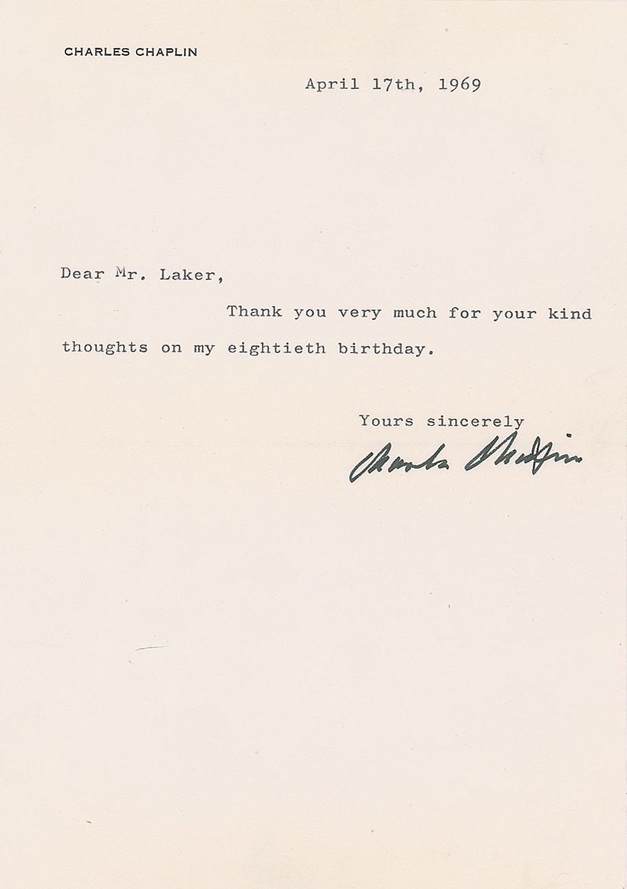 TLS, one page, 5.75 x 8.25, personal letterhead, April 17, 1969. Brief letter to Edward Laker, in full: "Thank you very much for your kind thoughts on my eightieth birthday." In fine condition. Accompanied by the original mailing envelope.