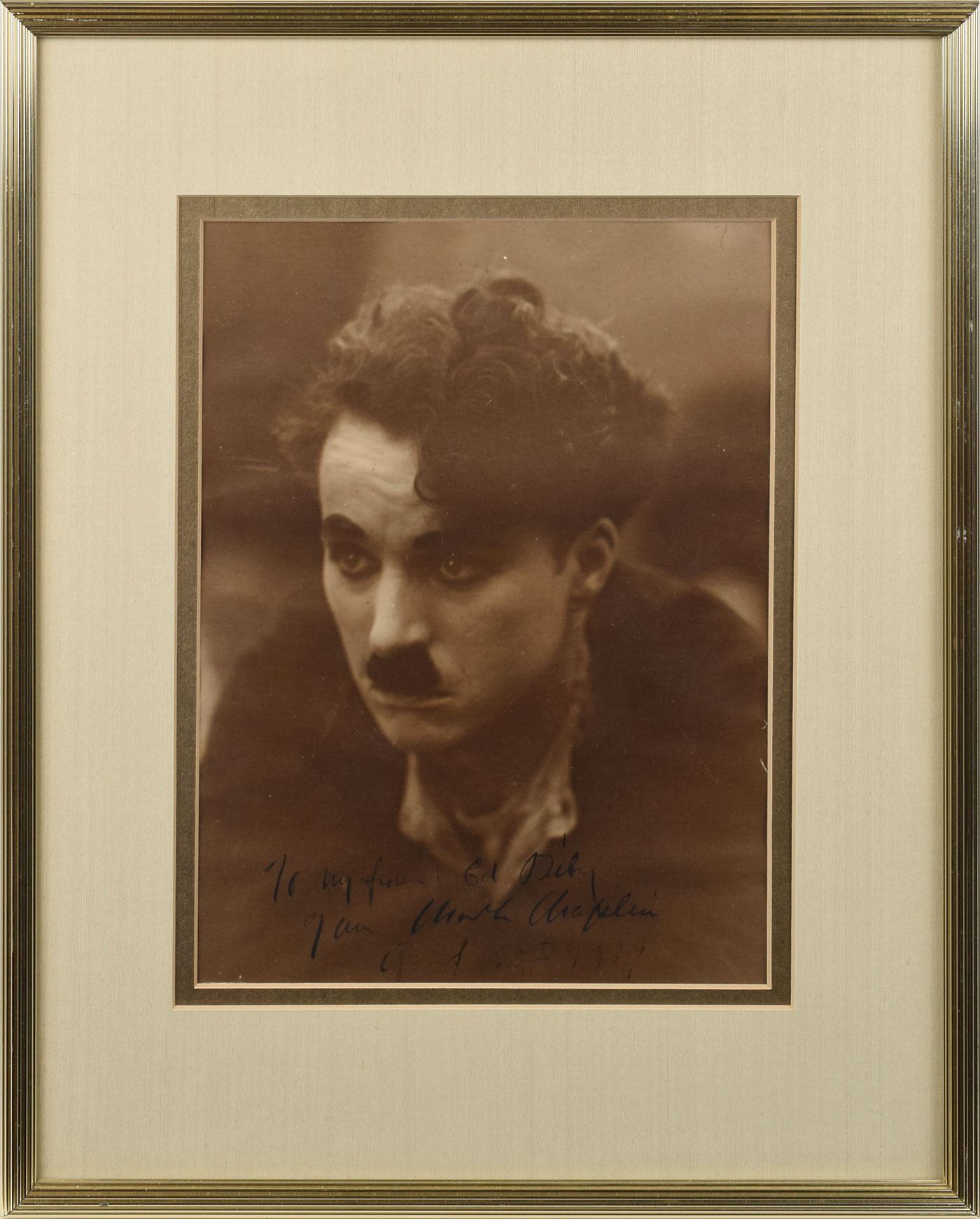 Excellent vintage matte-finish 9.5 x 12.75 close-up photo of Charlie Chaplin as his most recognizable character, with forlorn expression and trademark toothbrush mustache, signed and inscribed in fountain pen, "To my friend Ed Diby, from Charlie Chaplin, April 1st 1919.” Double-cloth-matted and framed to an overall size of 16.25 x 20.25. In very good to fine condition, with overall wrinkling, and heavy fading to the date.